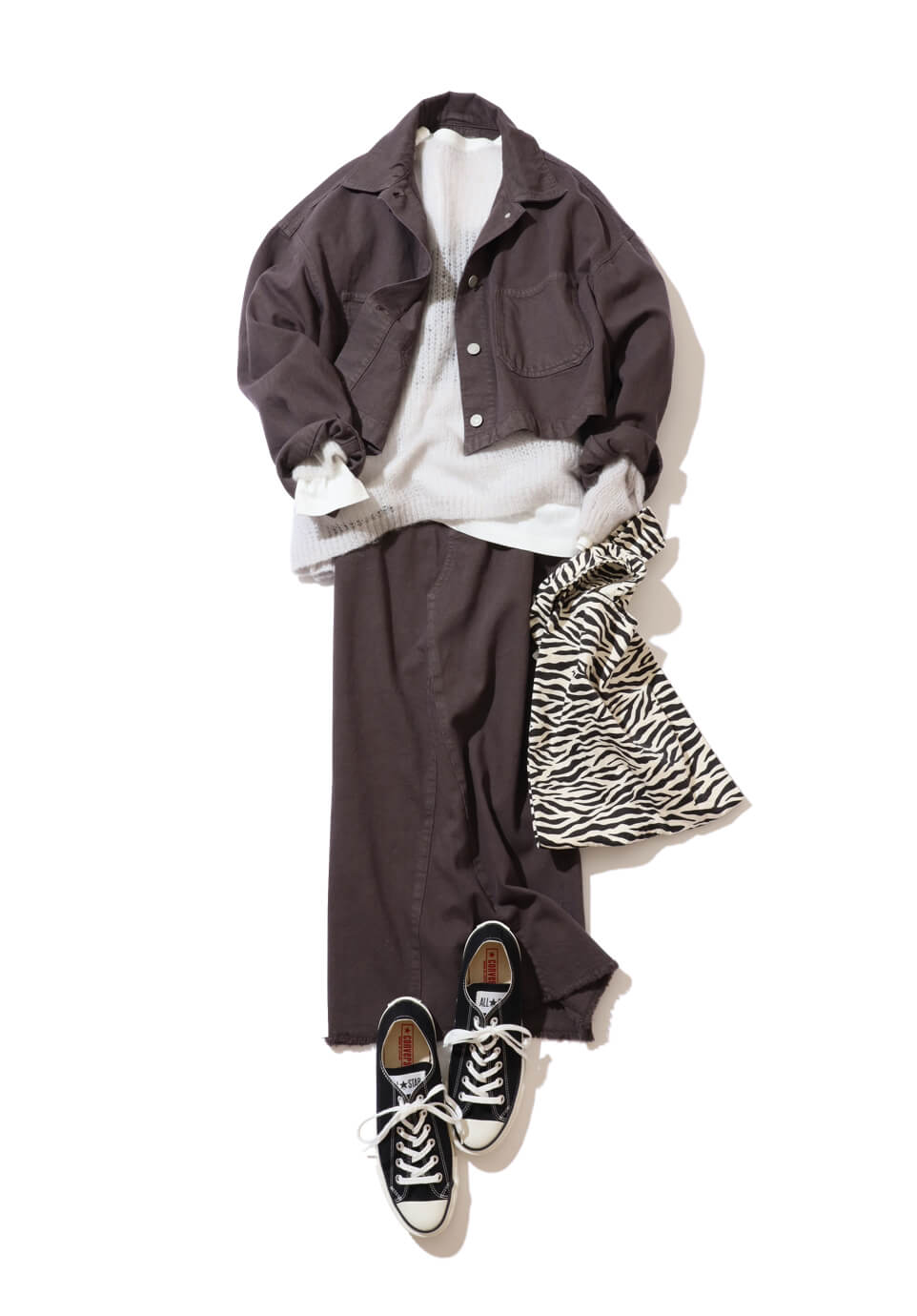 ブラウンがかったグレーが絶妙なニュアンスのデニムセットアップが主役。マキシ丈スカートと相性の良いコンパクトショートジャケットもお洒落指数が高めなデザイン。ラフなデニム素材だからこそ、中にはふわふわのモヘアニットを合わせてコントラストを効かせて。辛口なゼブラ柄バッグがスパイスに。