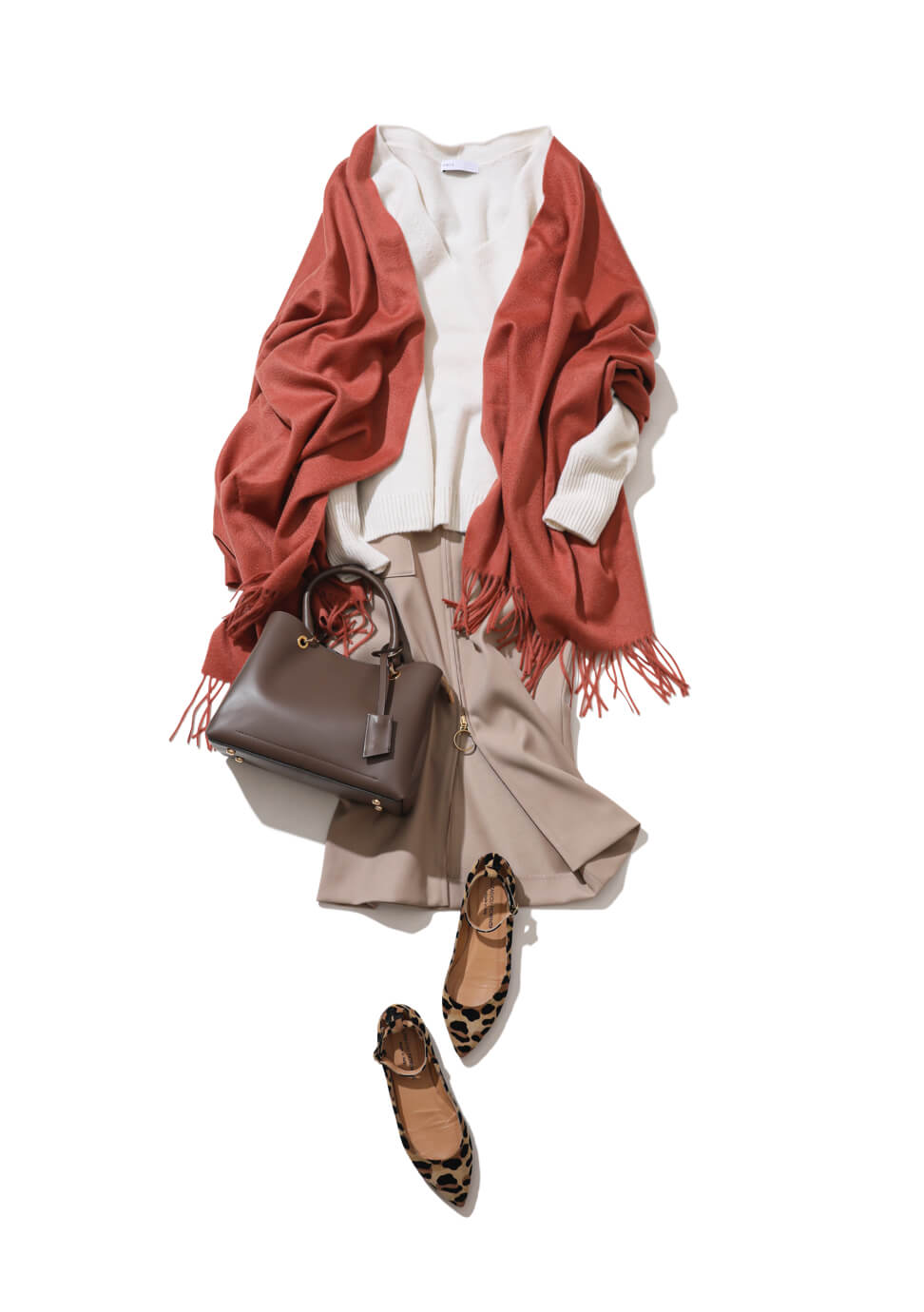 甘さと優しさを宿したベージュのワントーンコーデに飽きたら、グレーのグラデーションコーデがおすすめ。知的でクールな雰囲気にブラッシュアップ。滑らかな肌ざわりの上質なコートが、リュクスな大人像も演出します。インナーは、コートよりワントーン深いダークグレーのニット&パンツで奥行きを。チェーンバッグがリッチなアクセントに◎。