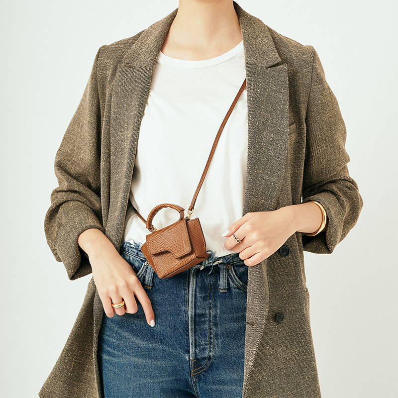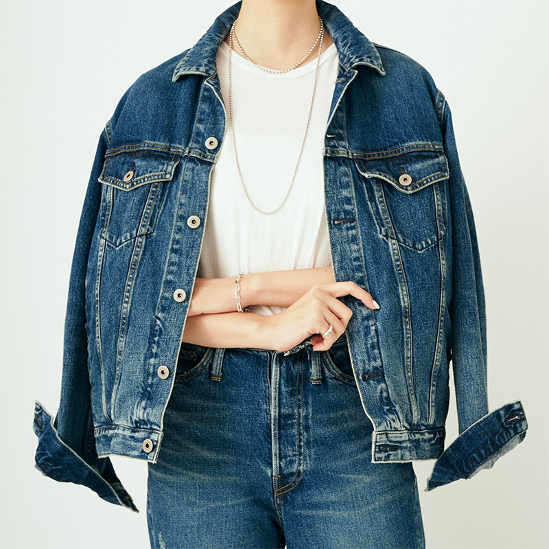 - DENIM JACKET季節問わず重宝するベーシックアイテム。大きすぎないシルエットなので、羽織だけではなく寒い時期はインナーとしても活躍。短めの丈感なので前を閉じてもバランスが取りやすい。