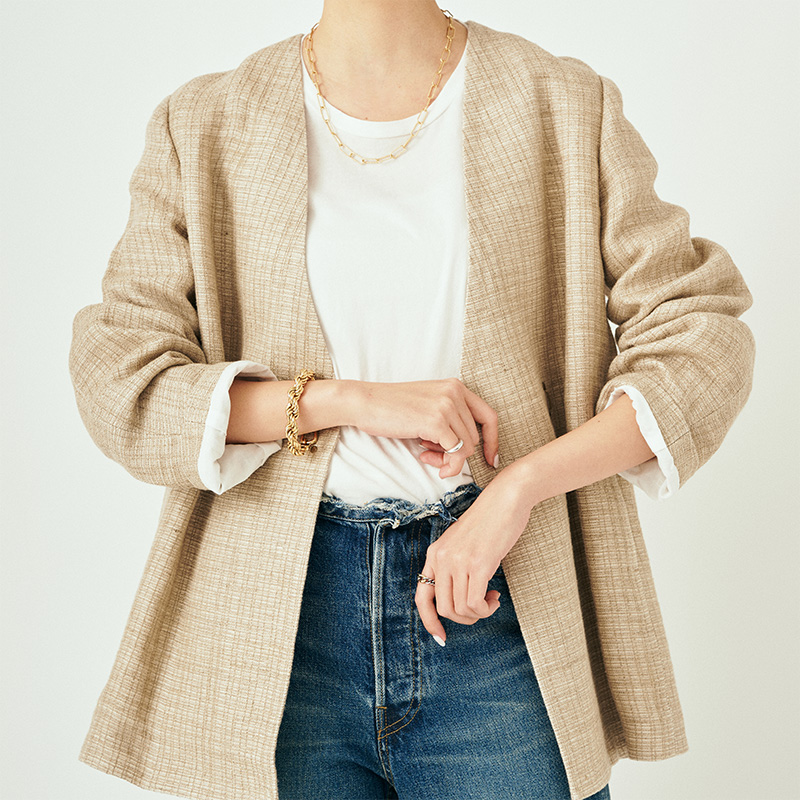 - R'IAM-PLAGE合わせを選ばないノーカラーのジャケットはいくつ持っていても間違いないアイテム。柔らかなベージュトーンでも存在感のある素材でこれからの季節にマスト。