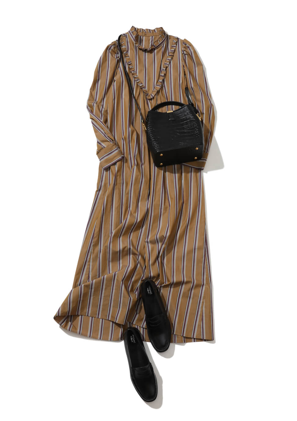 1枚で簡単に着映えるドラマティックなレトロワンピースは秋のヘビロテアイテム。首回りのフリルやマキシ丈などフェミニンな要素がたっぷりながら、マスキュリンなストライプで甘さを調節。季節の移り変わりを感じさせる、ハードな型押しレザーの黒バッグとローファーで、媚びないハンサムレディに仕上げて。