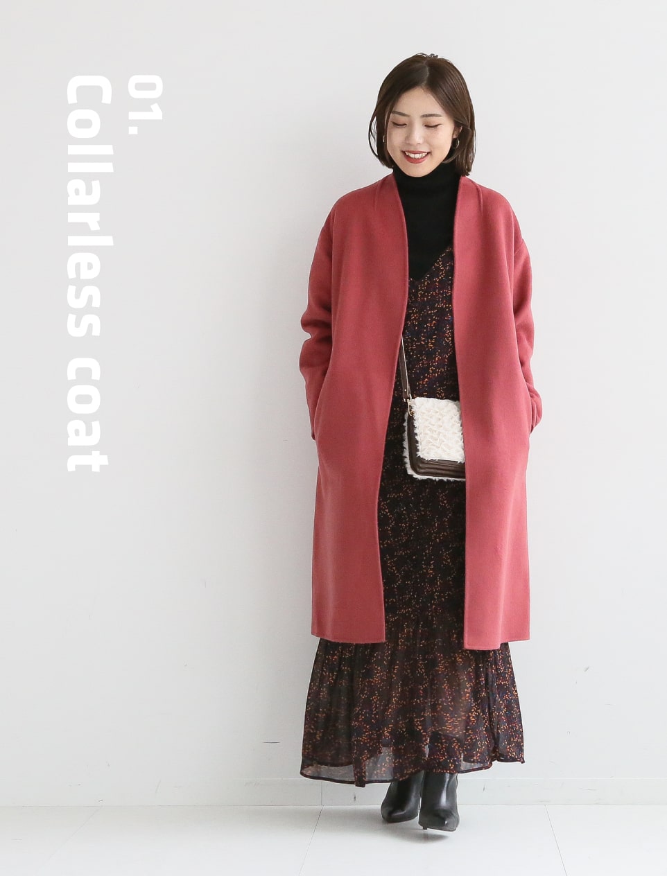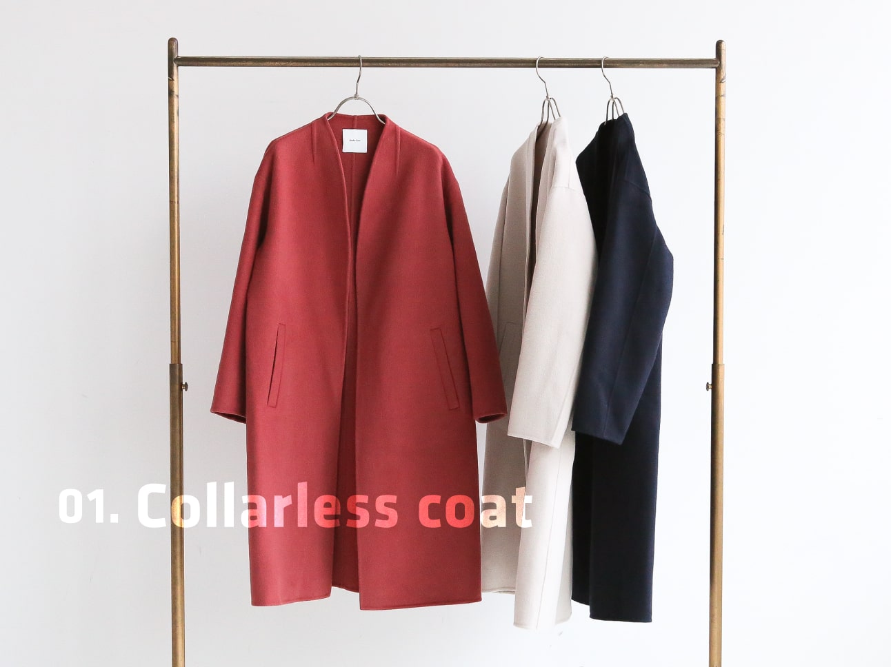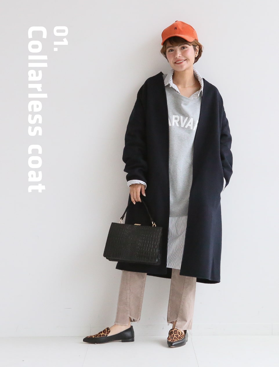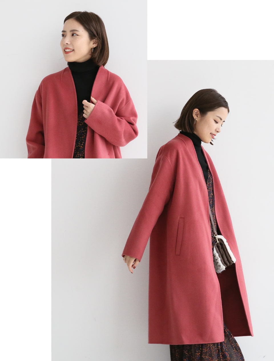 - 上品でフェミニンなイメージのノーカラーコート。コーデの邪魔をしないミニマルなデザインだから、カジュアルにも好相性です。