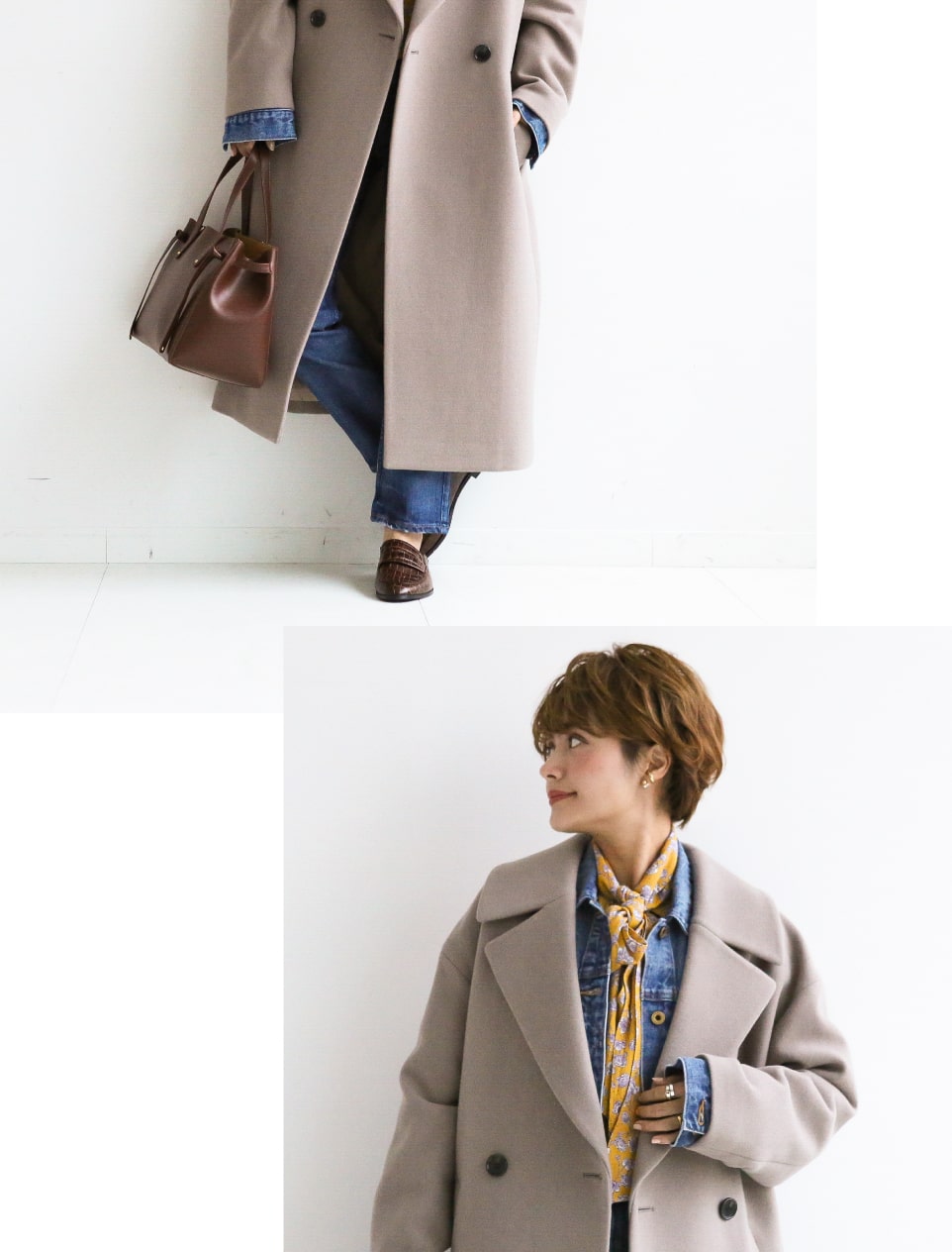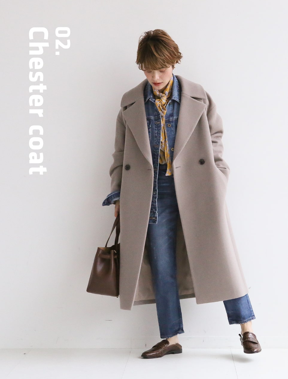 - トレンドのビッグラペルがエレガントな雰囲気たっぷりのチェスターコート。ラフなデニム・オン・デニムと媚びないハンサム小物を合わせて、カジュアルを一気に大人っぽくドレスアップ。