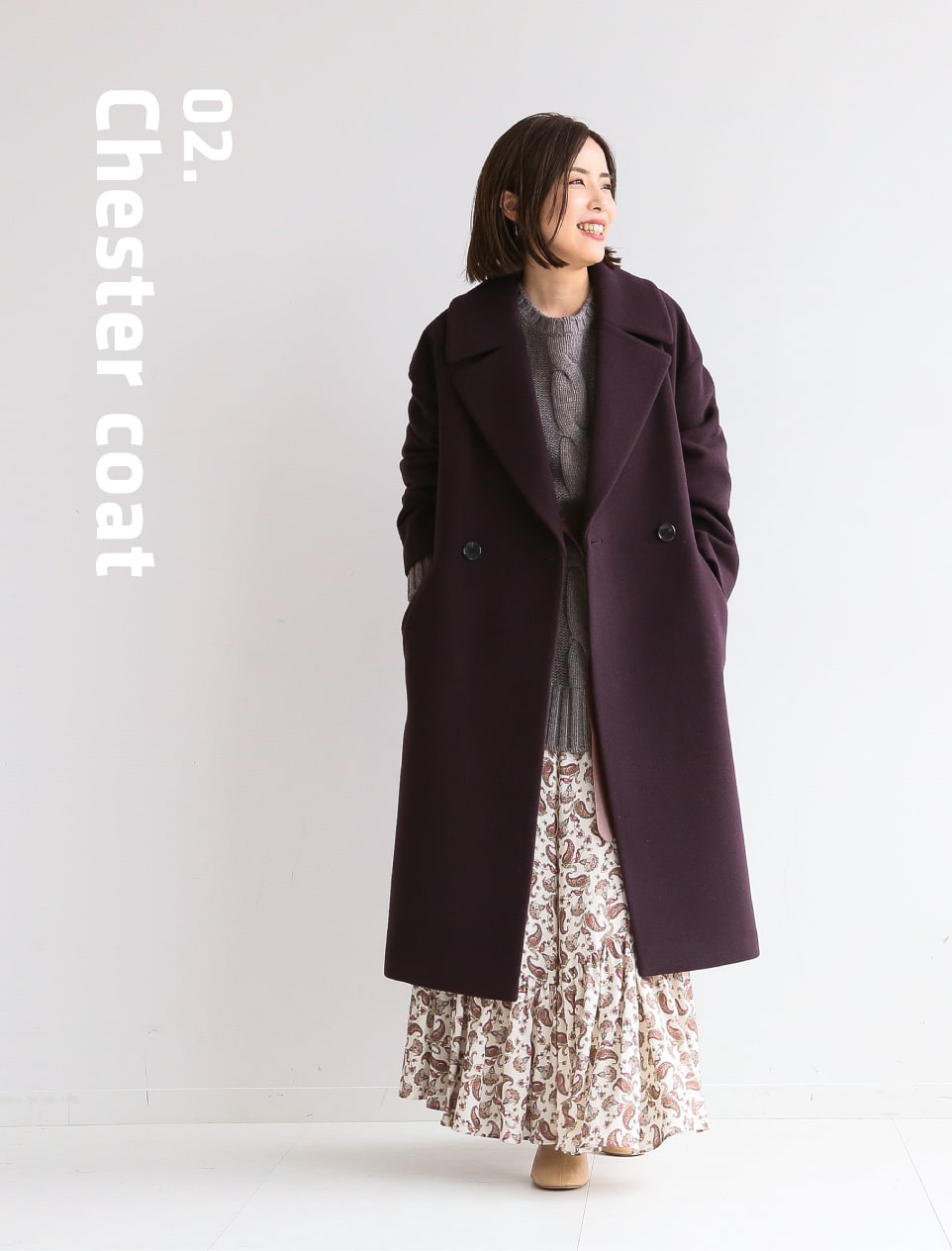 - 深みのあるブラウンのチェスターコートこそ、ドラマティックコーデの大本命。ざっくりしたケーブルニットで緊張感をほぐして、フェミニンなスカートをオン。足元はヌードなブーツが軽くてちょうどいい。