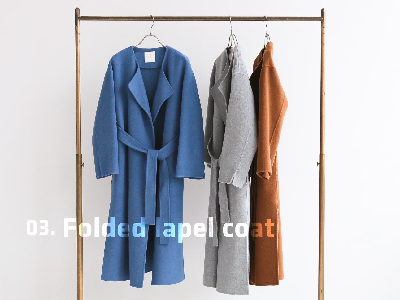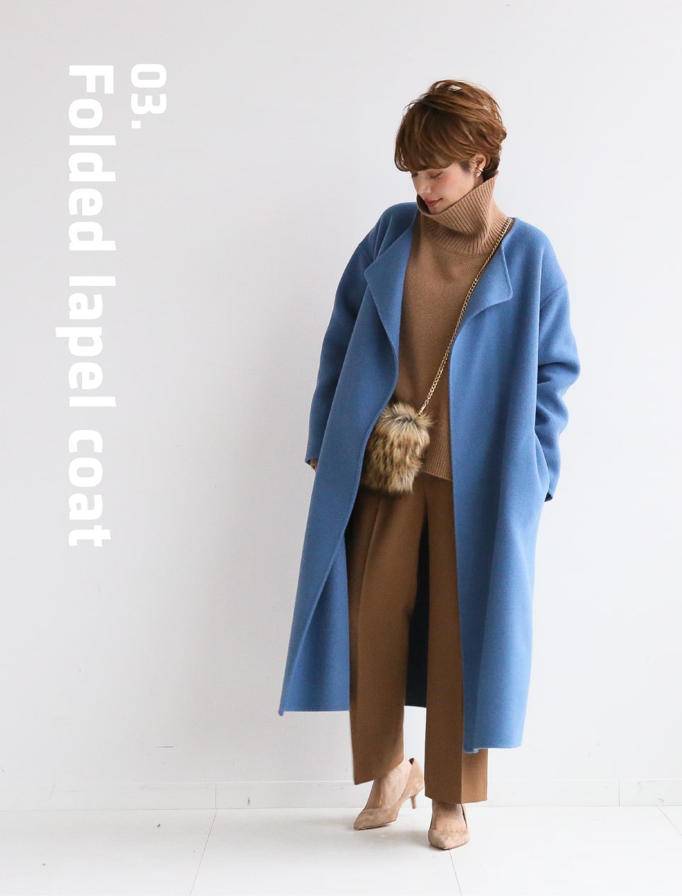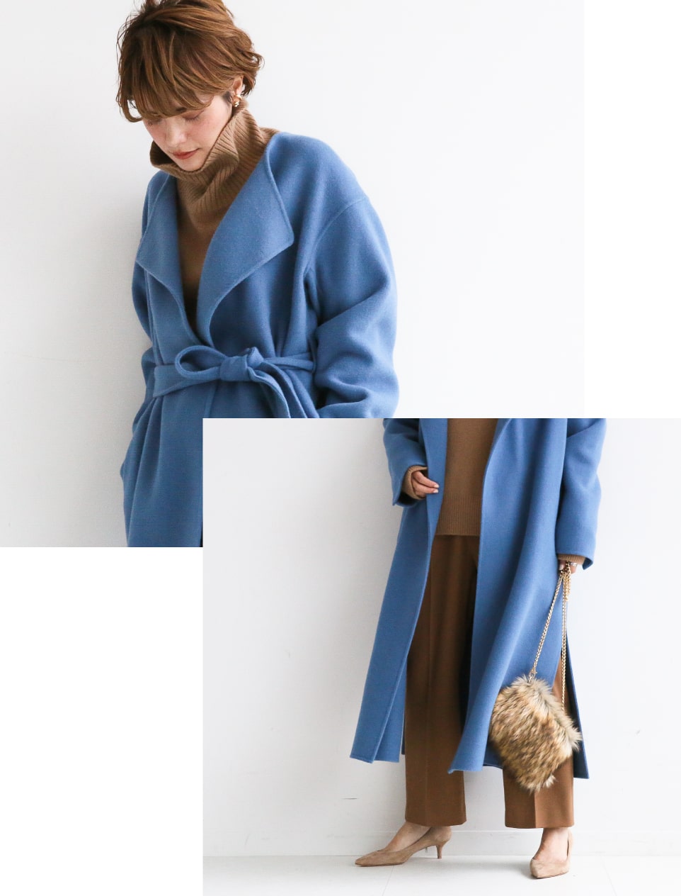 - ベルトマークのオン・オフで表情がぐっと変わる、グラマラスなフォールドラペルコート。この秋トレンドのブラウンと相性抜群なロイヤルブルーをさらりと羽織れば、パンツコーデの上品さが加速。