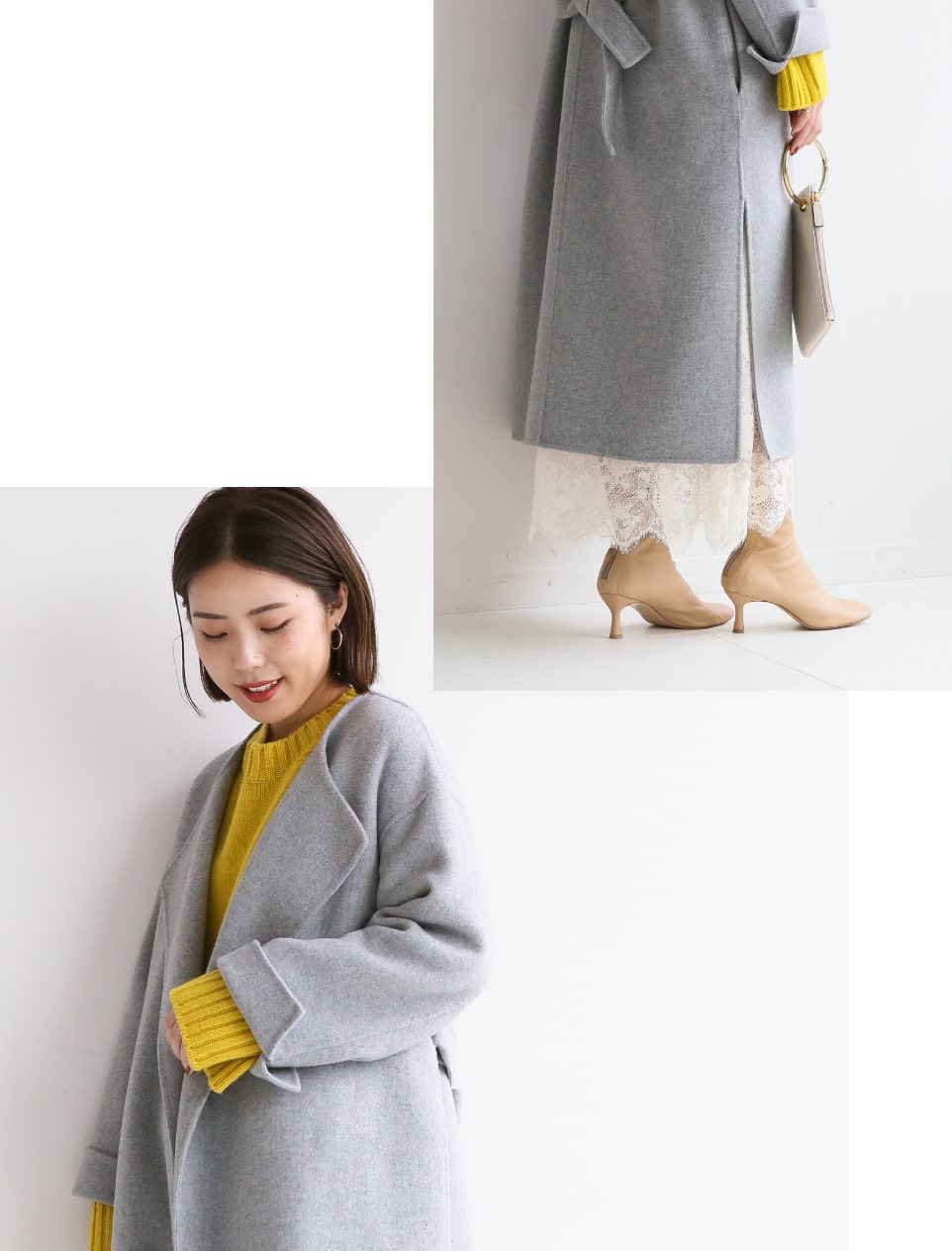 - 優しく馴染むグレーのビーバーコートには、イエローニットのスパイスを差し込んで。