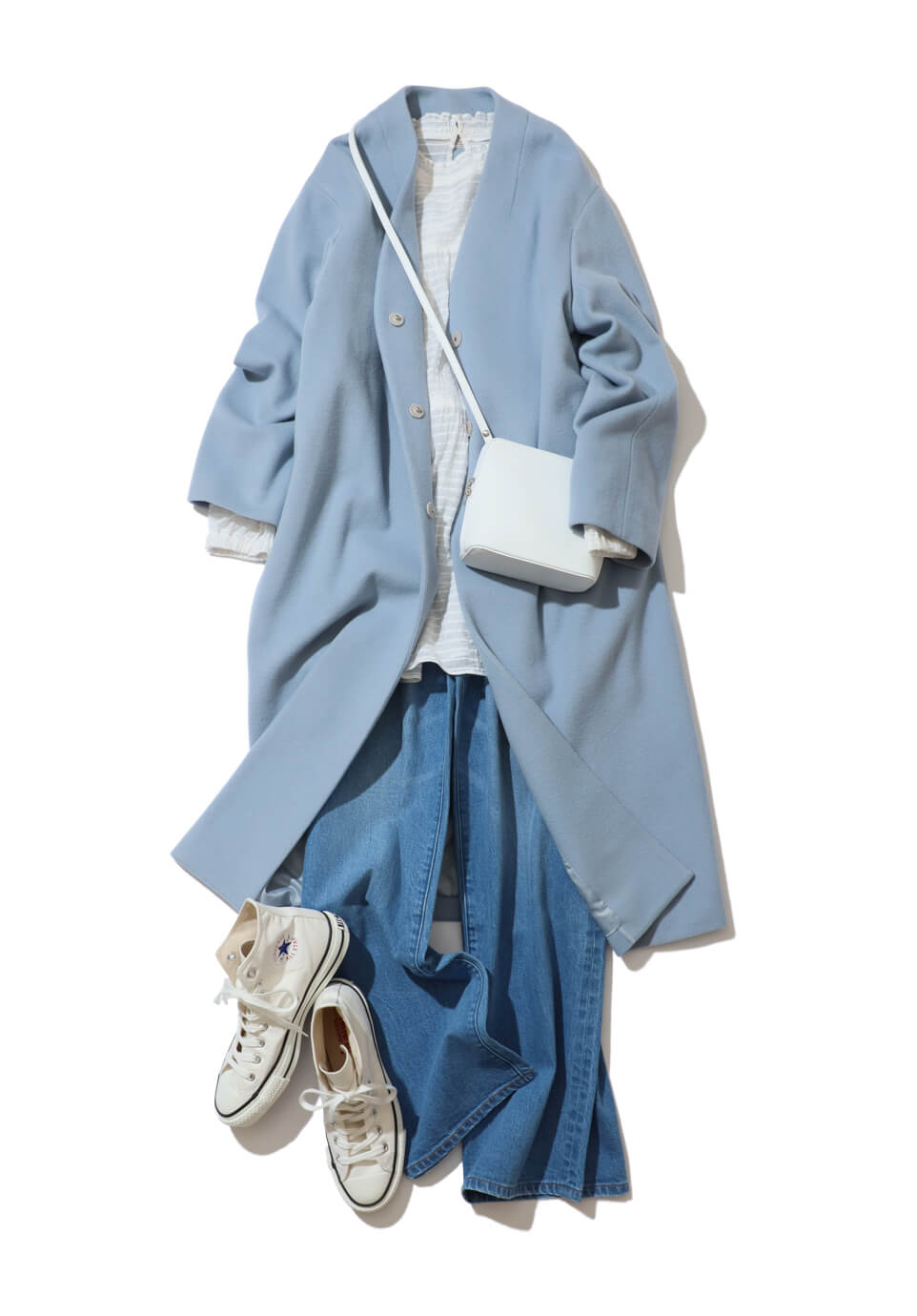 ラフなカジュアルムードたっぷりのウォッシュドブルーデニムのワイドパンツを、大人っぽく着こなしたい気分。そんな日は、レディなティアードブラウスの力を借りて。爽やかなホワイトをセレクトして、ショルダーバッグとスニーカーも色を統一。デニムと色を合わせたコートは、大人なノーカラーでさらに洗練度アップ。