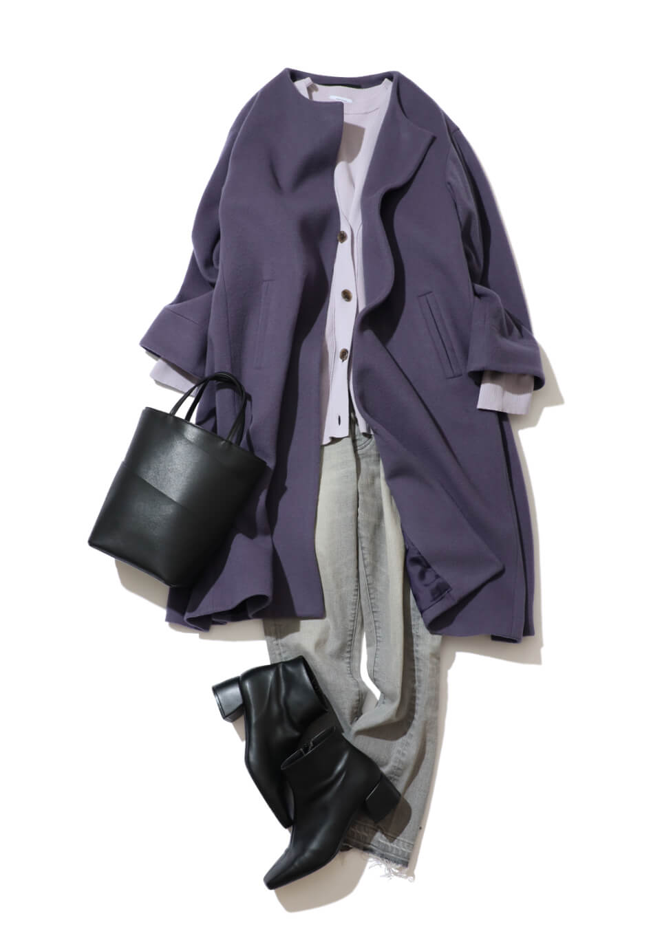 シンプルなデザインに加えて、柔らかいコットン素材だから春先までロングシーズン活躍するカーディガンとクルーネックのコンビニット。ニュアンシーなソフトパープルに、ライトグレーのデニムをMIXしてスタイリッシュにまとめて。コートはくすみパープルでトーンを合わせると色馴染みもマッチ。