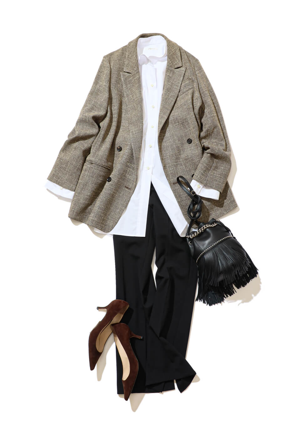 今日はリモートでの重要な商談。ミニマル&クリーンな白のバンドカラーシャツに、アウターは春先取りのツイードジャケットを初下ろし。画面に映らない足元も黒のストレートパンツで気を抜かずシックに。シャツとの着丈バランスも絶妙な、切れ味のよいハンサムコーデを完成させて。