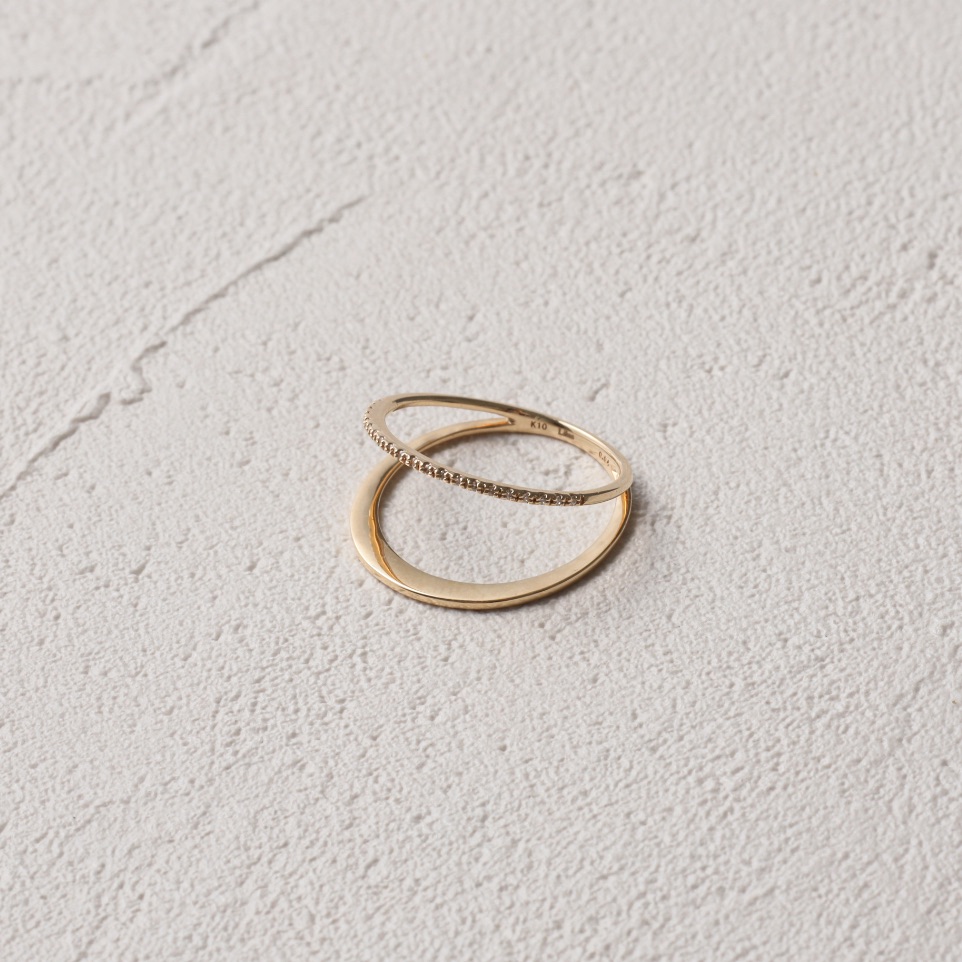 - ダブルラインの片側にメレダイヤをあしらった繊細なリング。2本重ねているレイヤードが簡単に作れて、抜け感のあるこなれた雰囲気に。