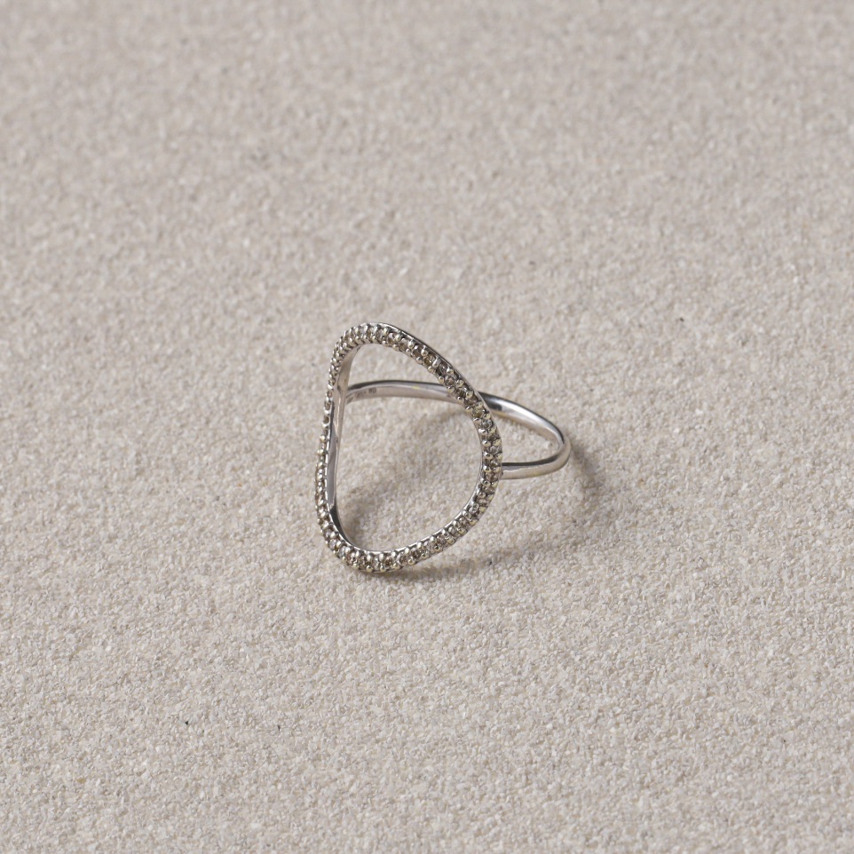 - 造形的なオーバルラインにメレダイヤが煌めくリング。ニュアンシーで存在感のあるデザインが印象的な手元をメイク。