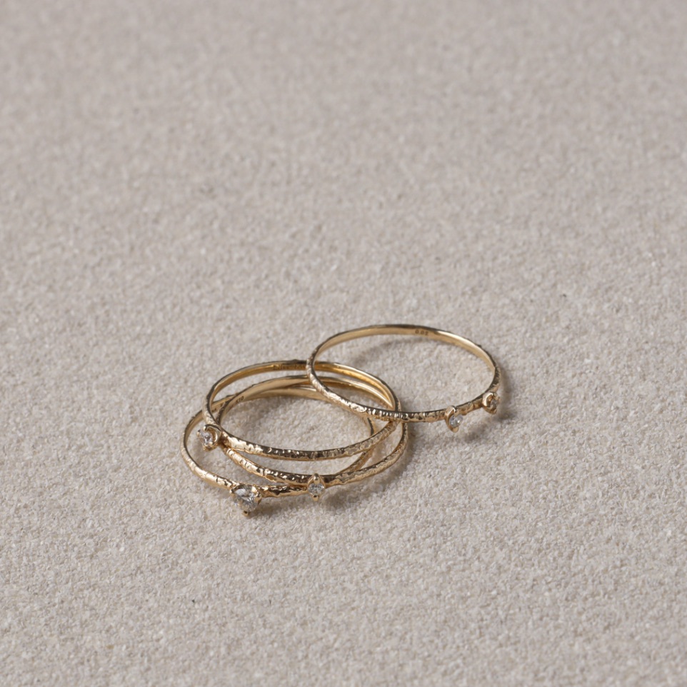 - 大きさの異なるダイヤモンドをランダムにあしらうことで、繊細ながらリズムが面白いデザイン。4本セットなので、自分なりのアレンジを楽しめます。