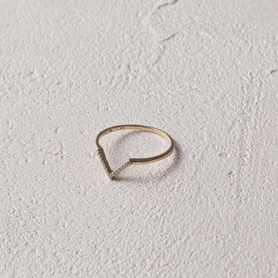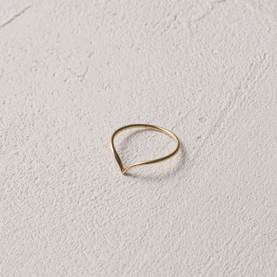- シンプルなVラインが魅力的なリング。手元にさりげない存在感を与え、レイヤードにもおすすめ。