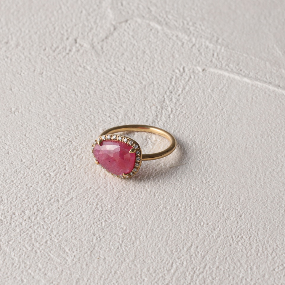 - 目を引く大きなルビーにオリジナルのスライスカットを施したリング。まわりをダイヤモンドで囲んだ贅沢なデザインが自信をくれそう。