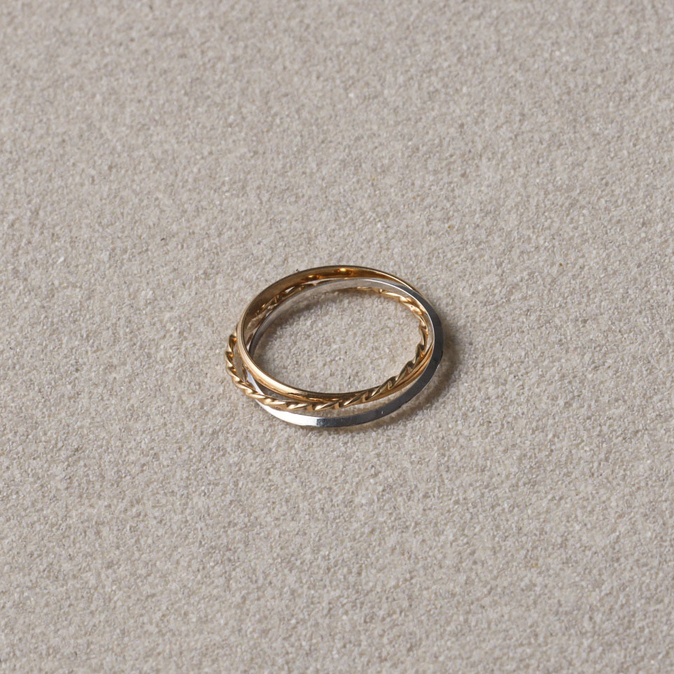 - シルエットが異なる3種類のリングを絡めたリング。バイカラーがトレンド感のある印象を後押し。