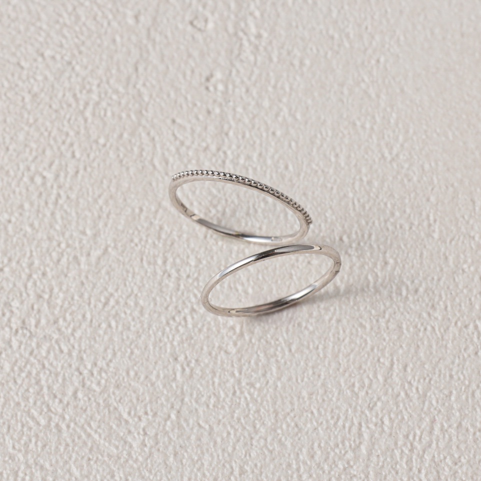 - 上から、ミル打ちを施したリングとシンプルなシルエットのリングを重ねづけ。シルバーならクールな印象がアップするので、ムードがよりスタイリッシュに。