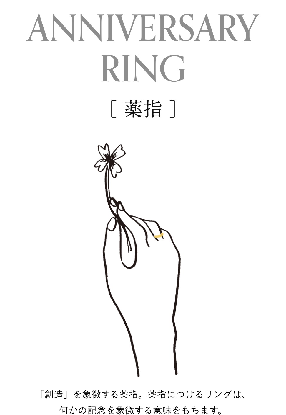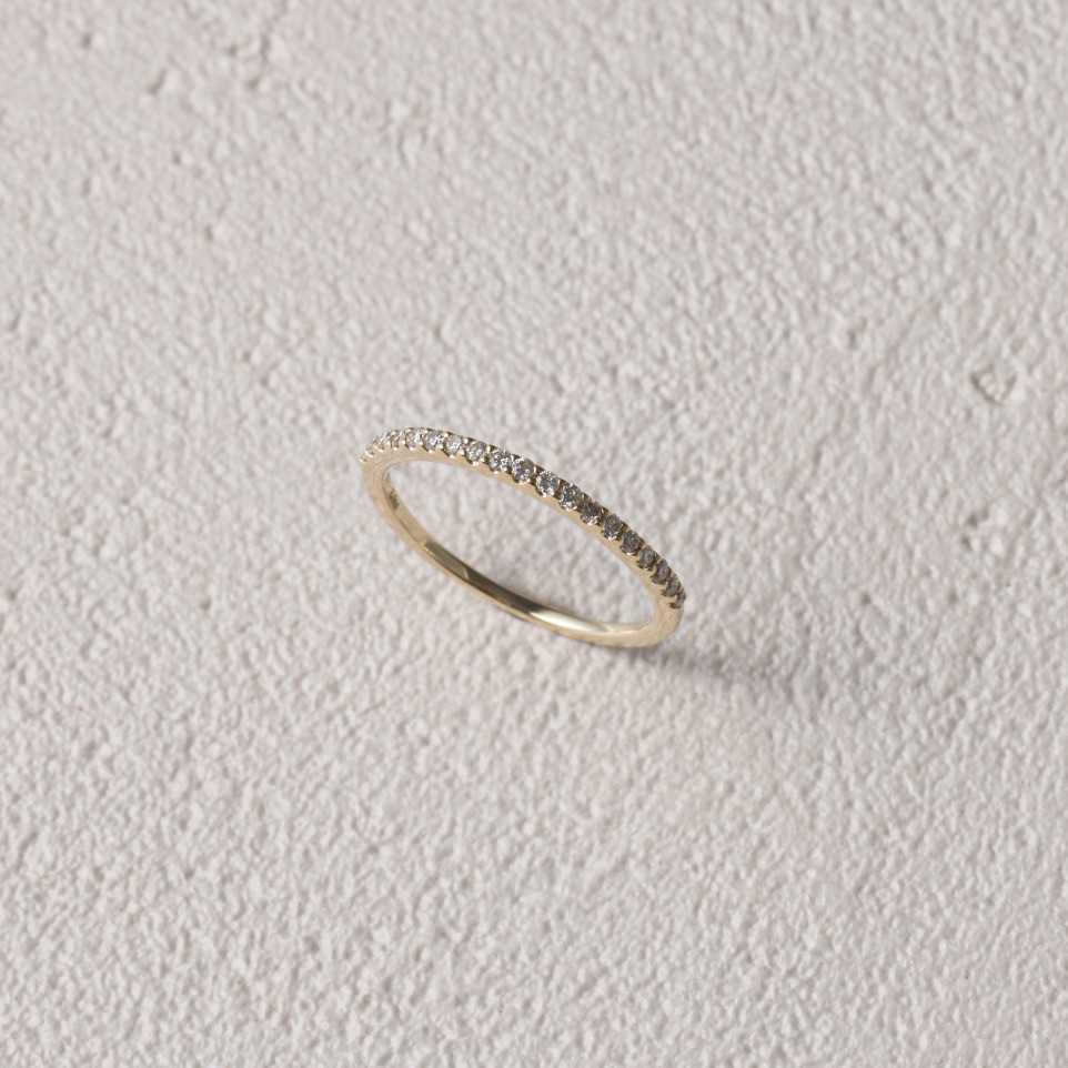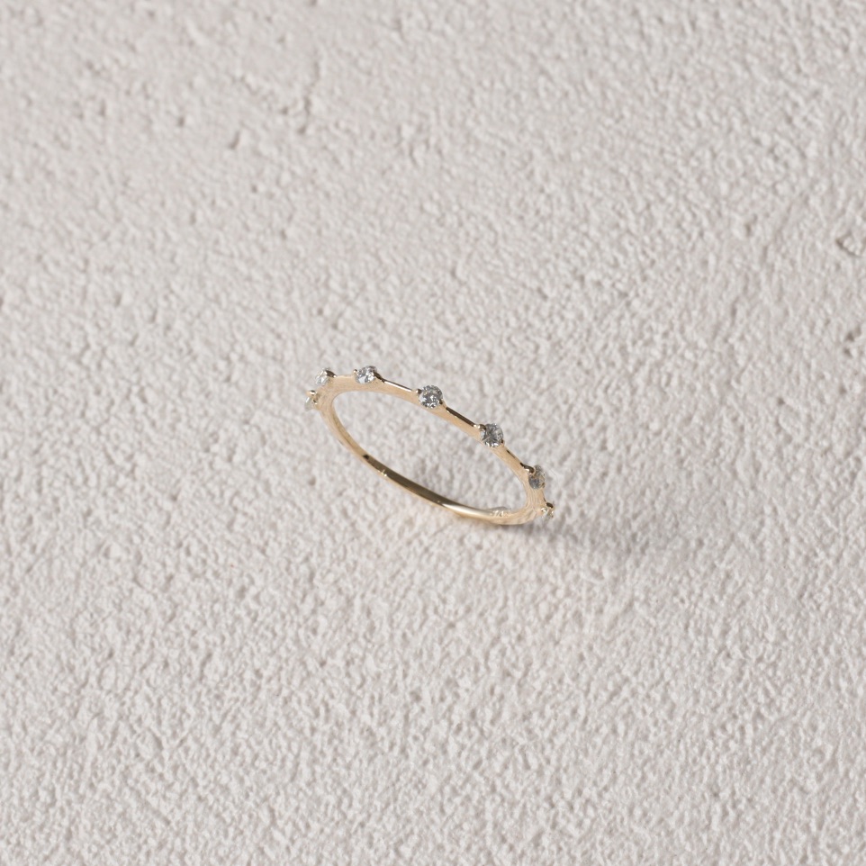- 7ピースのダイヤモンドを等間隔にセットしたリング。華美になりすぎずそっと素肌に馴染み、繊細な煌めきを放ちます。