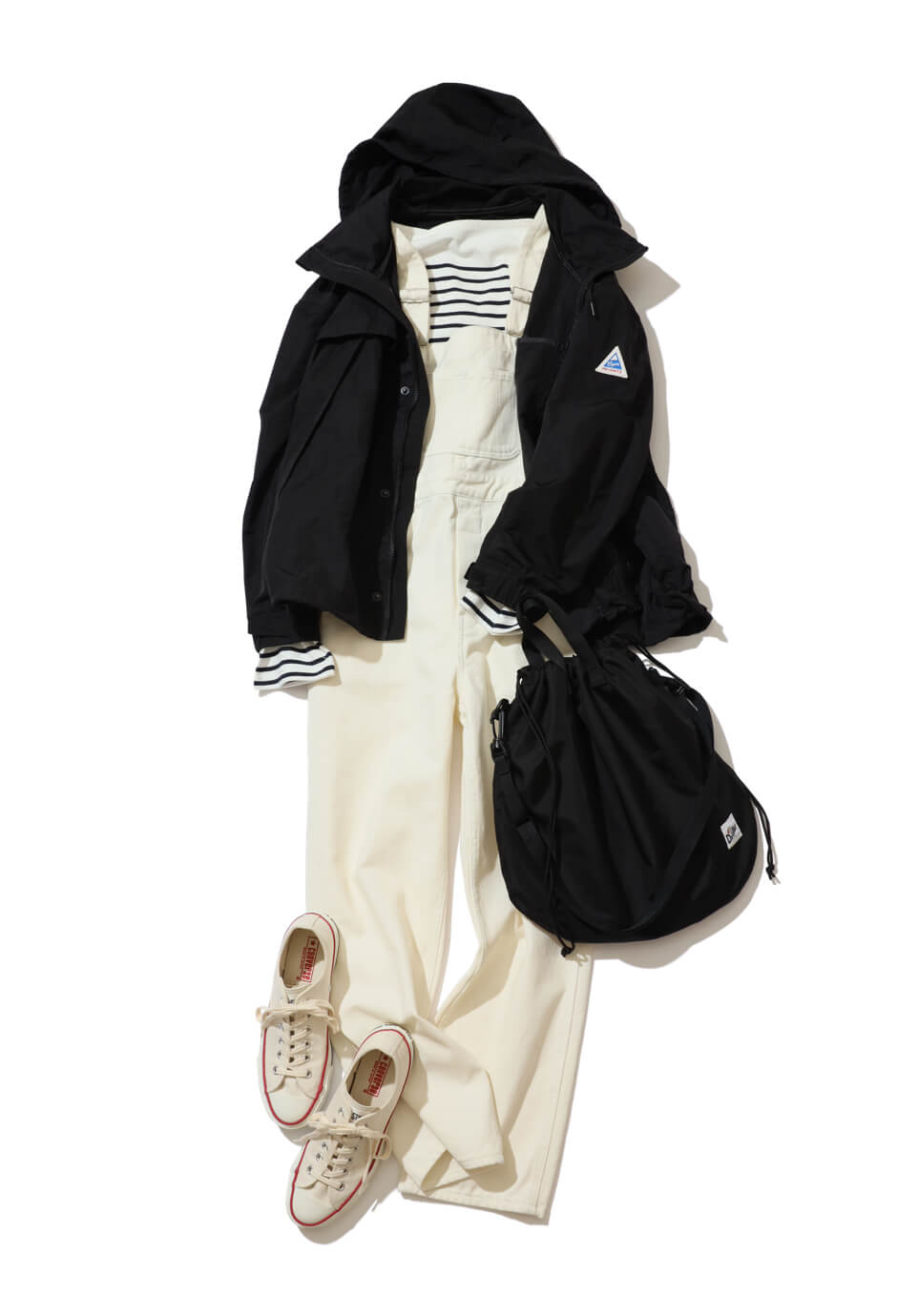 この春もたっぷりお世話になりたい、マウンテンパーカとボーダーカットソー。アウトドアなムードに振りすぎないで、都会的なエッセンスを取り入れて。合わせたオーバーオールは、クリーンな大人っぽい雰囲気のホワイト。足元のCONVERSEまで白でつないで。対してバッグは黒で引き締めを。