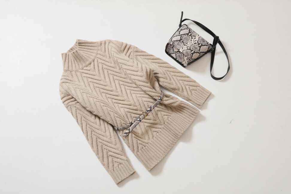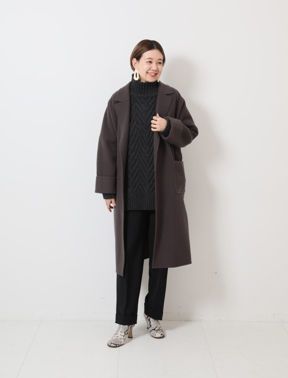 - さらりと軽やかに羽織れるダブルフェイスのコートは、秋から本格的な真冬まで長く使えて便利な1枚。シンプルなチェスタータイプなら、オン・オフ問わず重宝しそう。トーンを合わせたニットは、ざっくりしたケーブル編みがコーデに奥行きをプラス。辛口スパイスにパイソンブーツを効かせて。