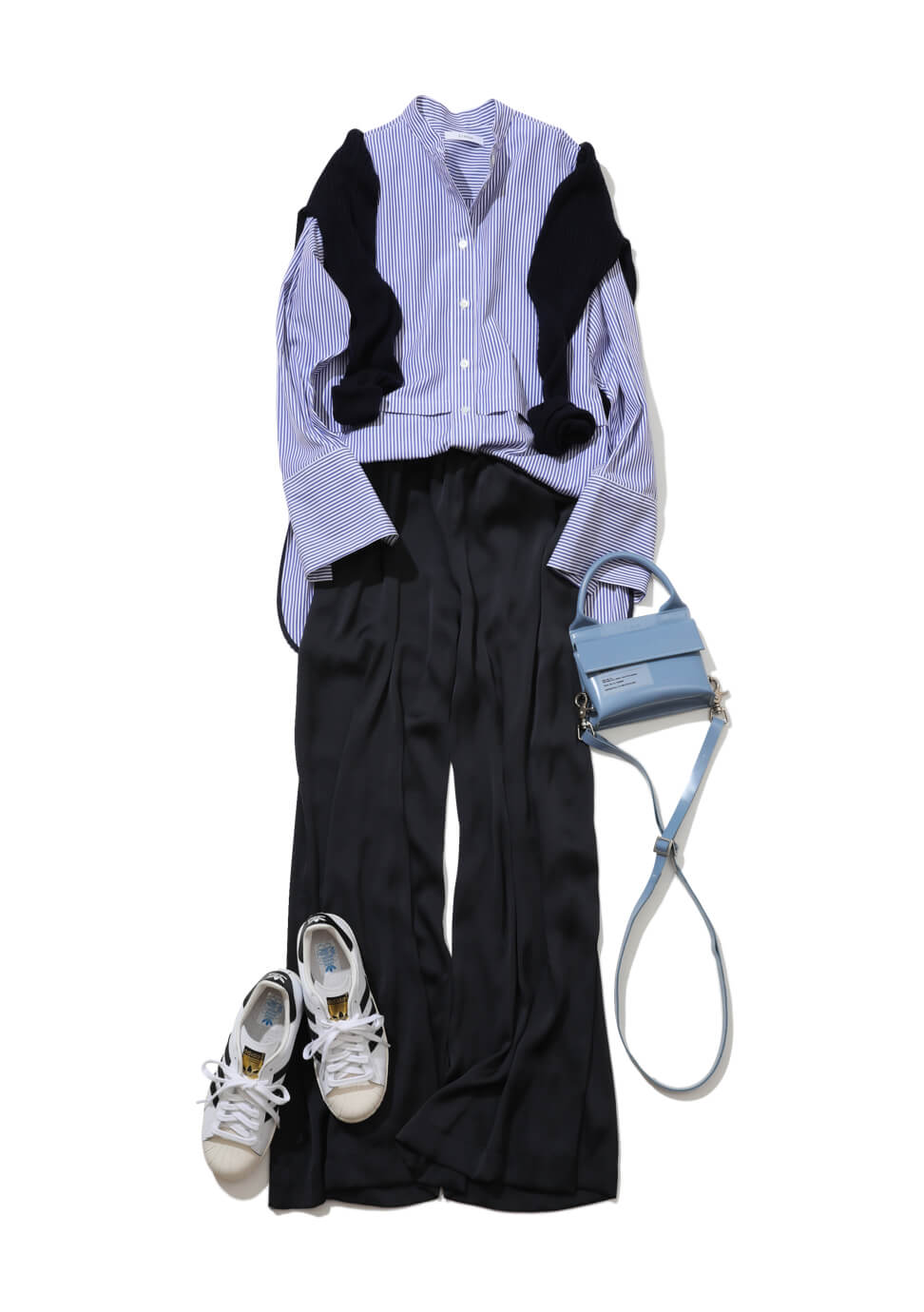 シャツ×パンツのきちんとコーデが求められる日。でも夏の終わりといえど炎天下だから、かっちりした洋服は気分が乗らない・・・。そんな時は、素材やシルエットでノンストレスに着こなしを楽しんで。見た目にも涼しげなブルーストライプはノーカラーでスッキリと。体が泳ぐワイドドレープのサテンパンツで、快適な履き心地とクラス感の両方をゲット。