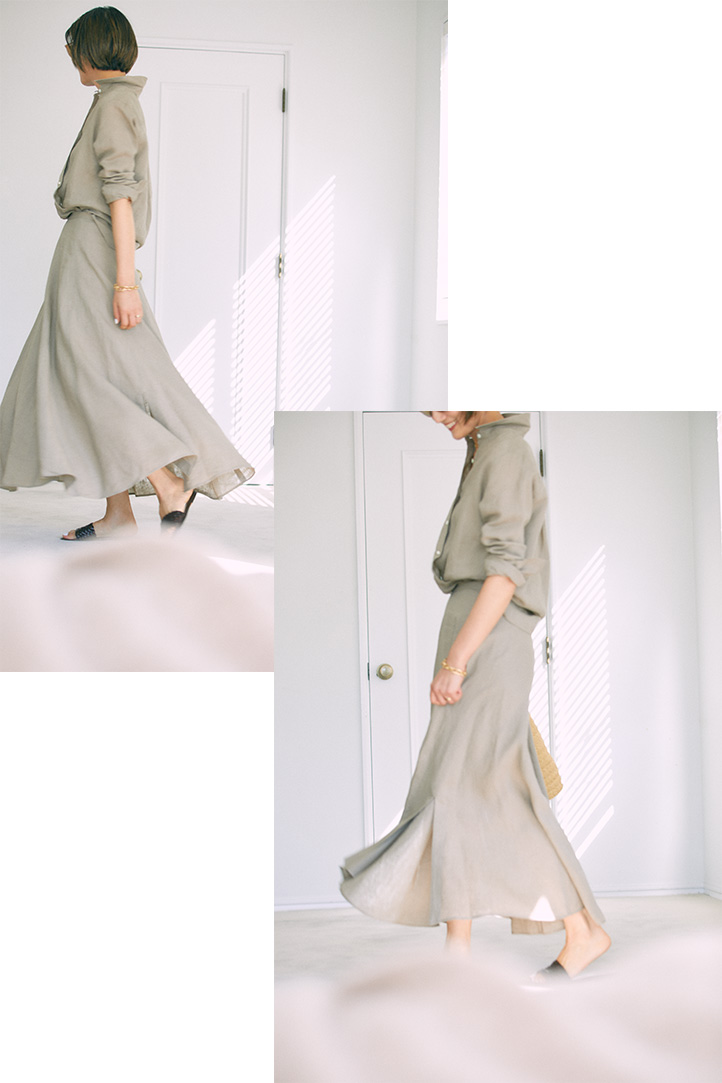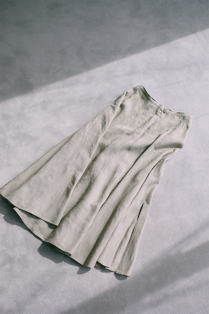 ボリュームたっぷりなマキシ丈のリネンスカートが一枚あれば、どんなシンプルトップスとのワンツーコーディネートもドラマチックに決まる。あえてウエストにギャザーを入れず、腰からヒップにかけてタイトめな作りでまっすぐなラインに、また裾にかけて一気に分量を出すことで歩く度に裾が揺れ、エレガントなムードも満喫できる。裾に施したスリットから脚が見え隠れするのも女っぽく、重く見えがちなマキシ丈を軽やかに見せてくれる効果も。リネン100%のドライな質感とサンドカラーで甘くならない大人のスカートスタイルを手に入れて。