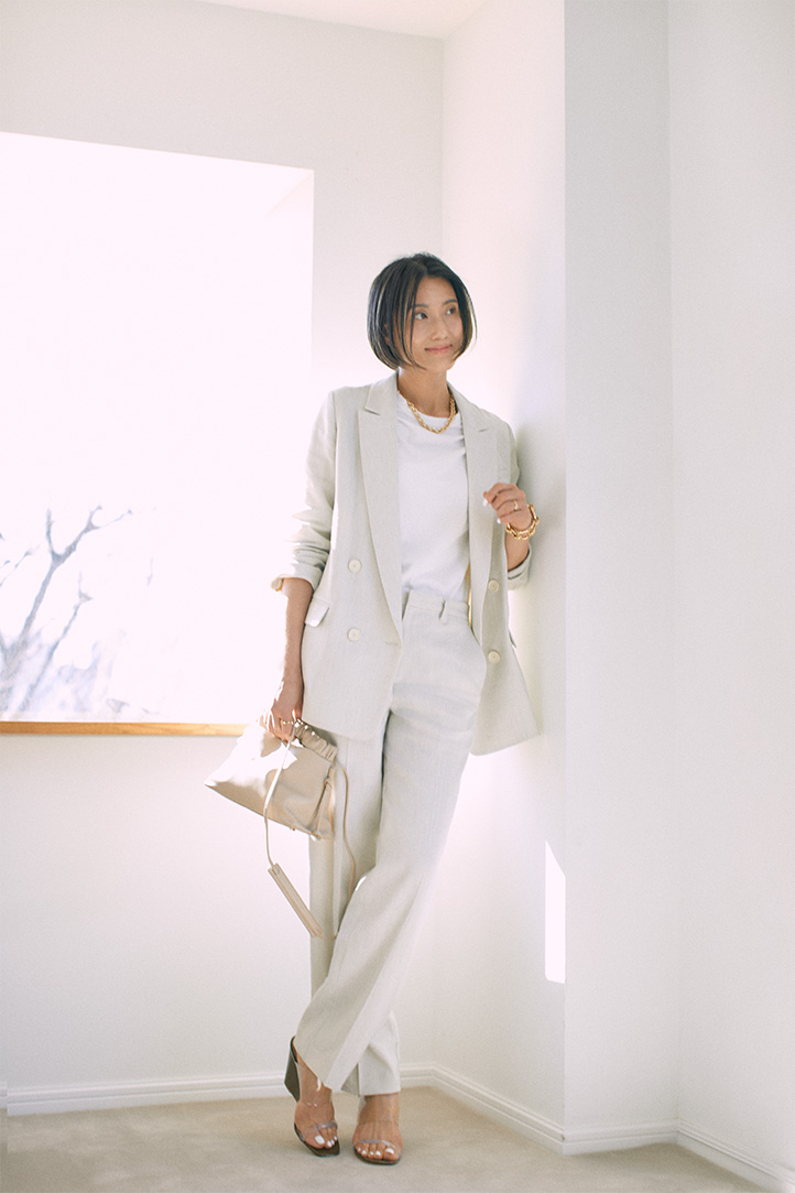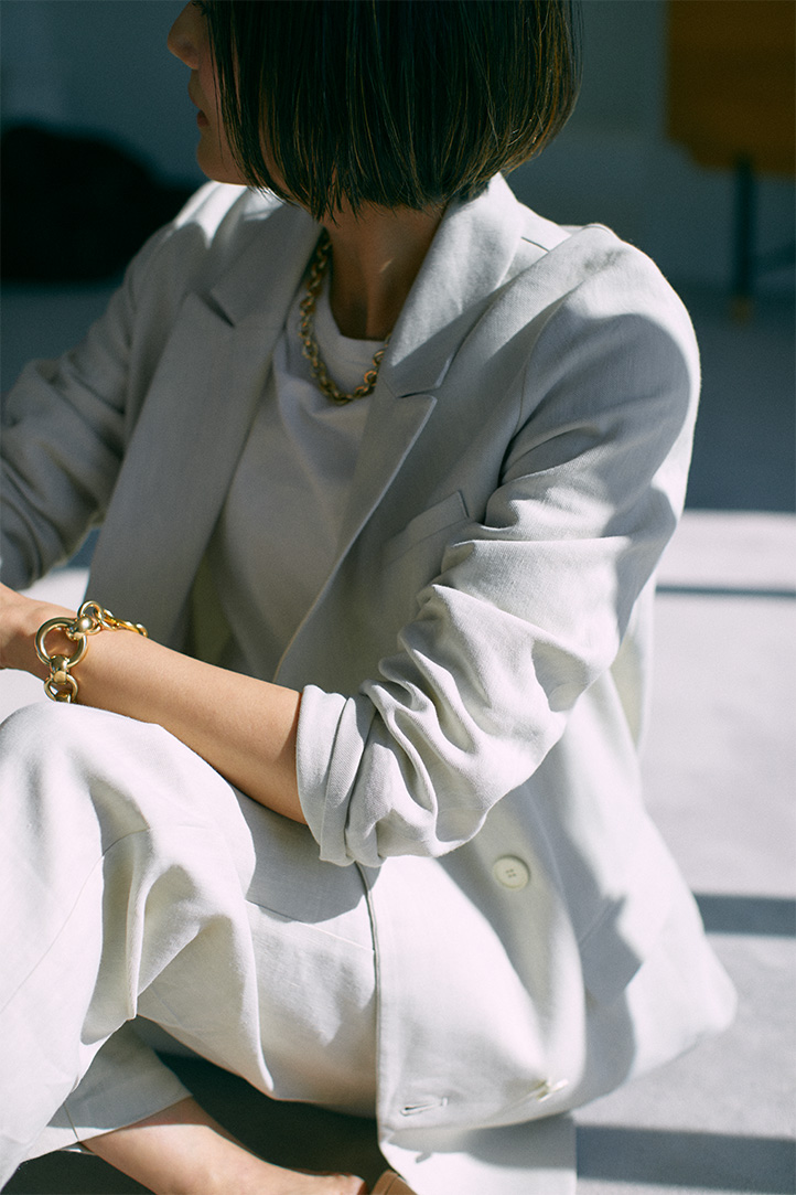ハンサムになりがちなジャケット&パンツのセットアップは、ほどよく力の抜けた着こなしで今らしいムードを演出したい。例えば上下ともに余裕のあるサイズ感を選んでタイトすぎないシルエットを意識。また小物は大振りのゴールドジュエリーでメリハリを効かせるのも効果的。ジャケット&パンツのセットアップはそれだけで十分かっこいいので、ジャケットの袖をラフにたくし上げたり、ウエストは腰で落とし気味に履くなど、適度に着崩すのがちょうどいい。白に近いライトグレーの色みが肌を明るく見せつつ、さりげないこなれ感も漂わせてくれる。