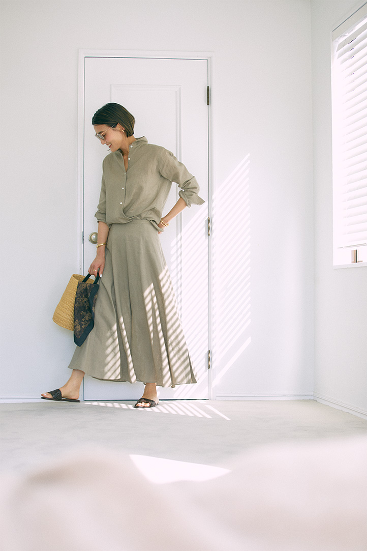同色のリネンシャツを合わせてワンピース見えする着こなしなら、瞬時におしゃれな印象が手に入る。ほどよくゆるいシルエットのシャツはストレートに着るとリラックス感のあるムードに、またボタンの位置を変えることでカシュクール風にもなる2way仕様。前だけボトムインにすることで上半身に自然な立体感が生まれ、気になる腰まわりもカモフラージュしてくれる。フィット&フレアなスカートが下半身をすっきり美しく見せるから、スリッパタイプのフラットサンダルもバランスよく決まるのもうれしい。かごバッグやゴールドジュエリーと合わせれば初夏気分もアップ。
