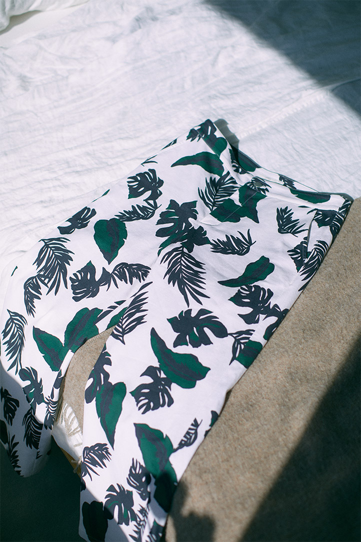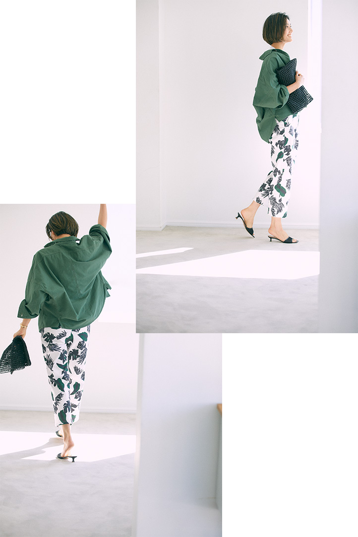 羽織るだけでコーディネートに奥行きが出る構築的なフォルムのビッグシャツを投入。柄パンツと色のトーンを合わせることですらっと細見えする着こなしに。肩から袖にかけてボリューミーな袖や絶妙な着丈、一般的なシャツよりも厚みのある素材感は、端境期の今からに初夏にかけて着回し力抜群。ぐっと襟を抜いて一枚で着るのはもちろん、ミリタリージャケット感覚で羽織りにしてもいい。インにクリーンな白いノースリニットを重ねると、ほどよい抜け感が生まれ涼やかなムードに。遠目からもパッと目を引くプレイフルなトロピカル柄パンツで、瞬発力のあるおしゃれを満喫したい。