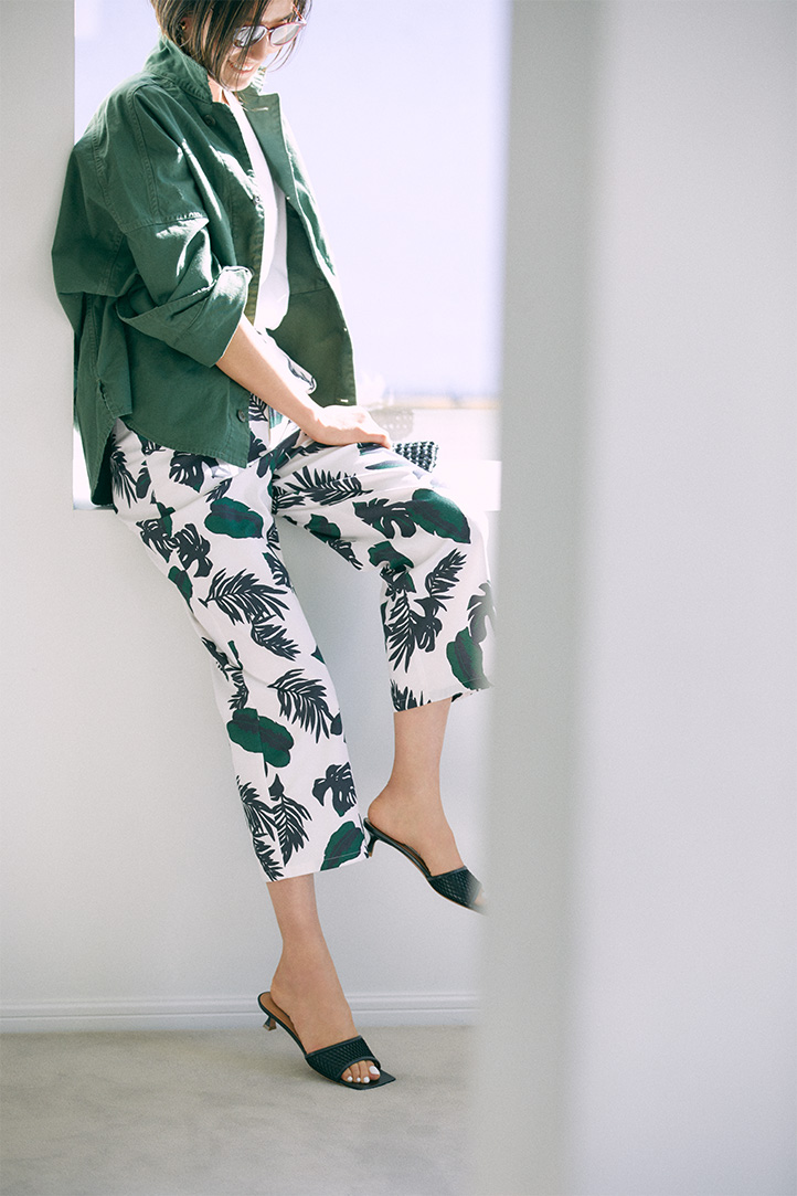 着こなしに新鮮なモード感を取り入れたいなら、キャチーな柄アイテムを投入するのがおすすめ。ボトムなら大柄でも派手見えせず、ベースのホワイトが上品かつ涼やかな印象に導いてくれる。ほどよく肉厚感のある素材とつかず離れずのシルエットは、体のラインを拾わず誰もが着こなしやすいよう計算されて。リゾートで映える遊び心と街中でしゃれて見えるモダンさが両立したトロピカルモチーフは、寒色系で色数を抑えているのでデイリーにも活躍。一枚でパッと目を引く柄パンツがあれば、見慣れた手持ちトップスも鮮度がアップ、新しいパンツスタイルの可能性を広げてくれる。