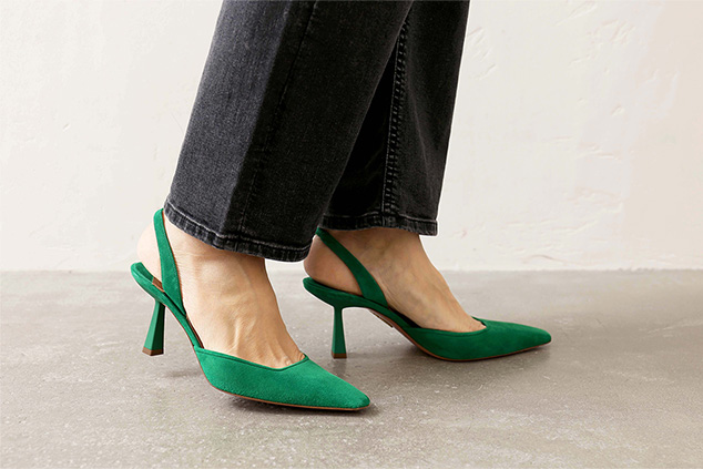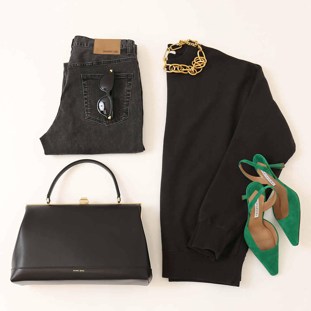 スタイリングのアクセントになるのは鮮やかなグリーンが印象的なAQUAZZURAのサンダル。ベーシックスタイルをクラスアップしてくれる。
