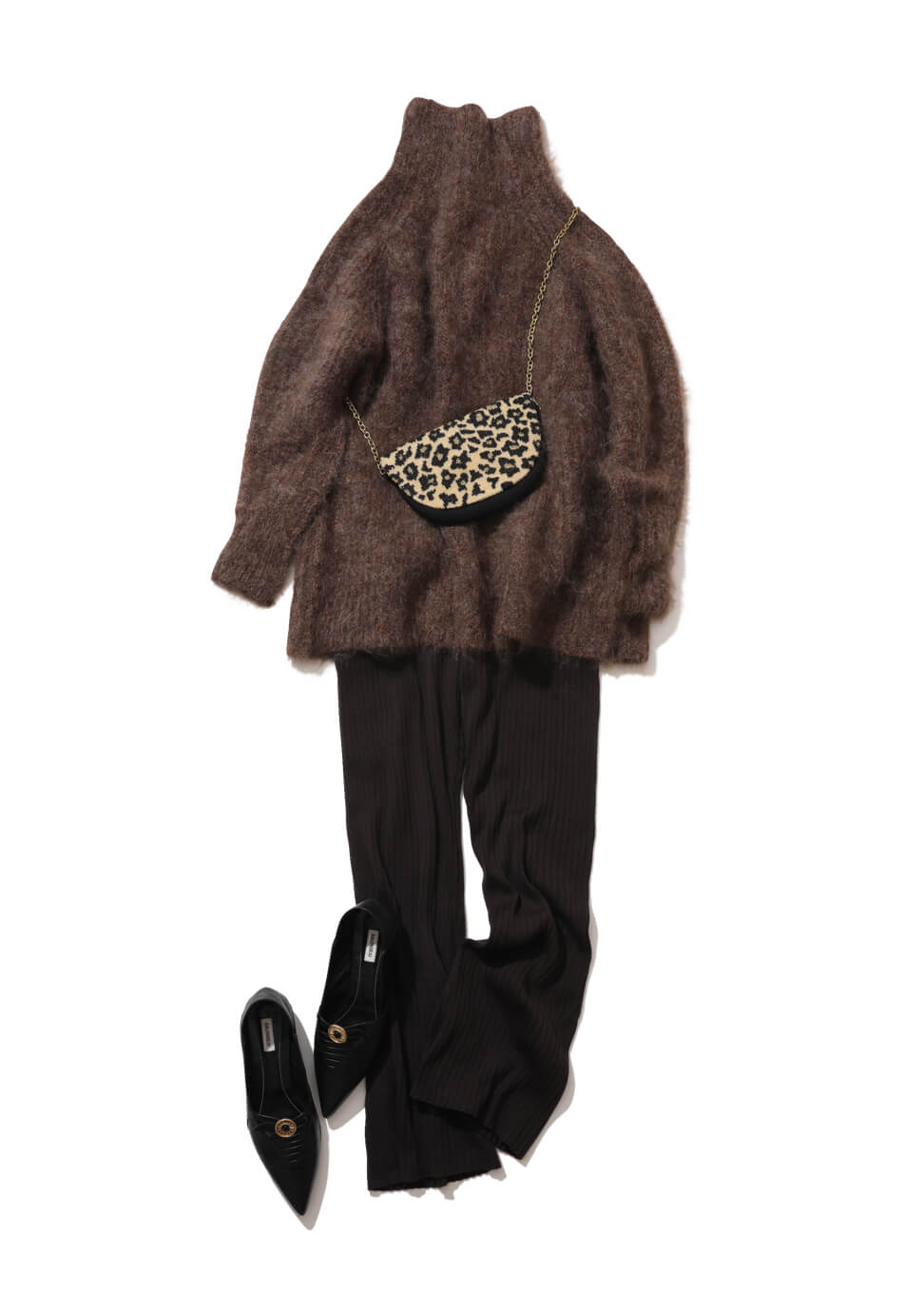 毛足の長いモヘアで、多色の糸を編み込むことでさらにニュアンスたっぷりなタートルネックニットを潔く1枚で。ヒップまで隠れるボリューム丈だから、華奢見えしながら温かさもキープ。ダークブラウンのリブパンツを合わせて、モダンなブラウンコーデをメイク。キャッチーな金具のパンプスや、ヒョウ柄バッグで遊び心を忘れずに。