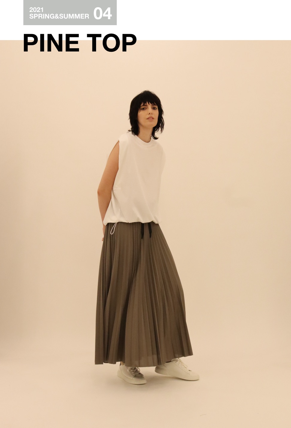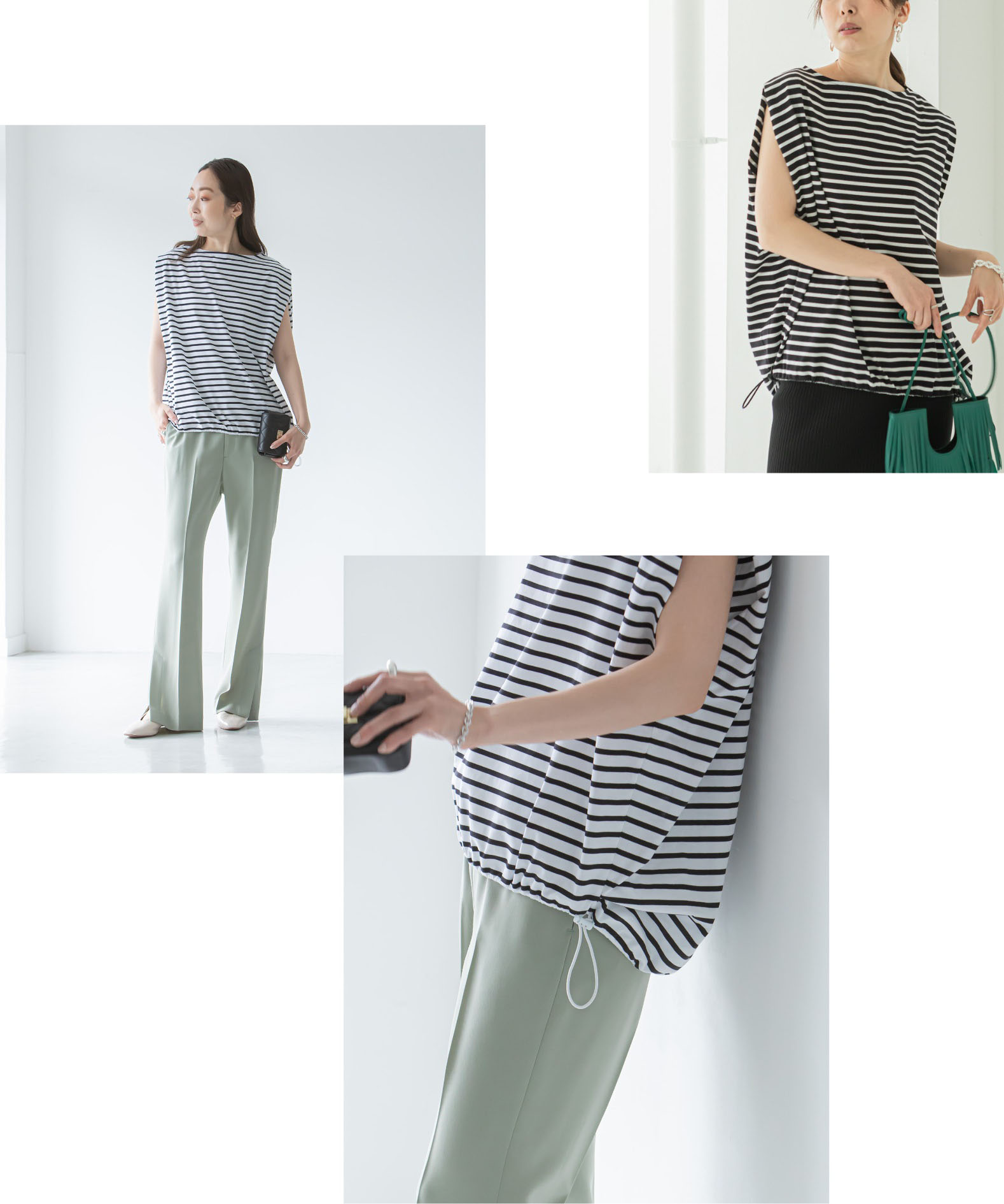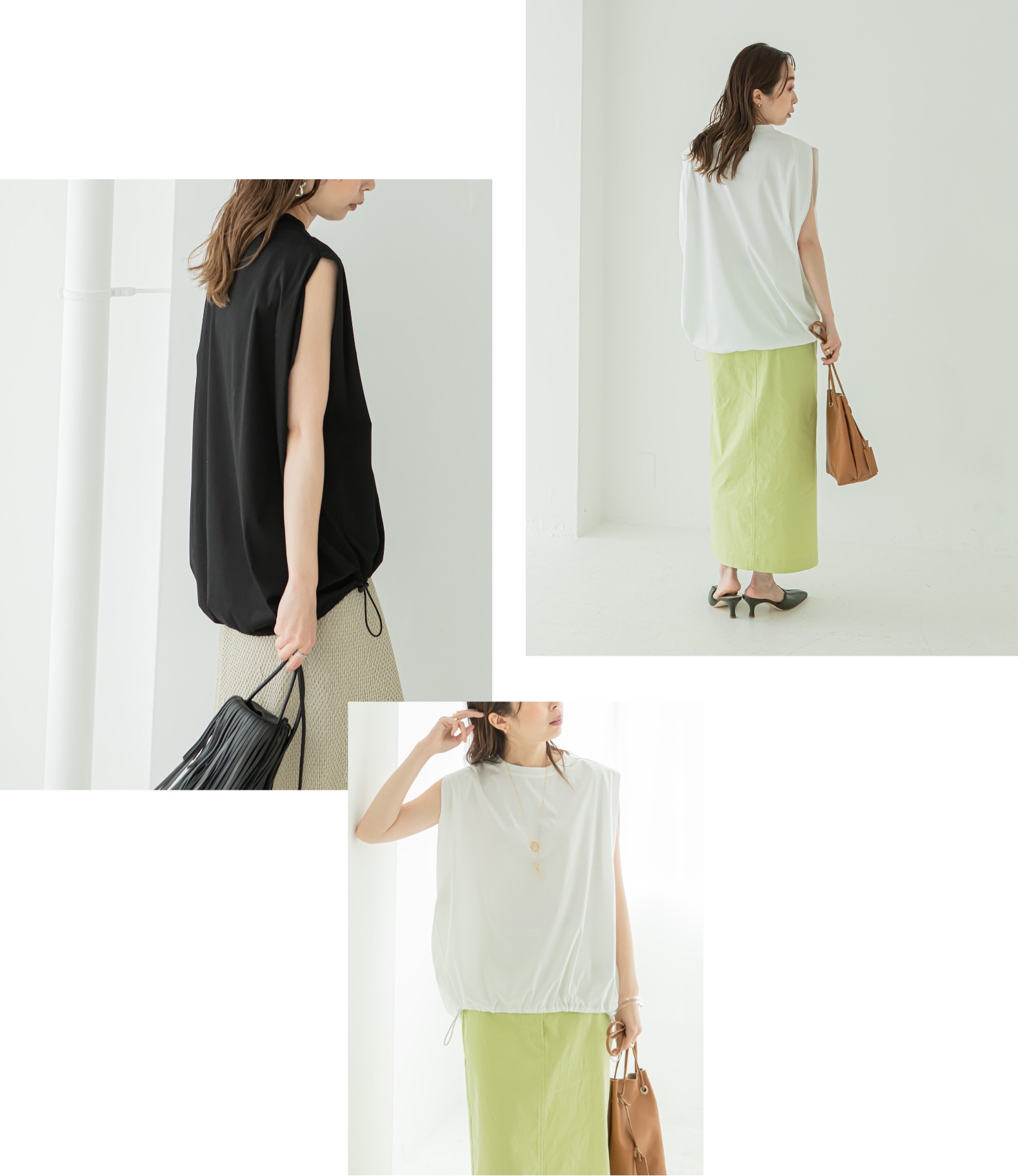 - すっきりとしたミニマルなデザインと裾にドロストを配した丸みのあるフォルムとのコントラストで魅せるノースリーブカットソー。