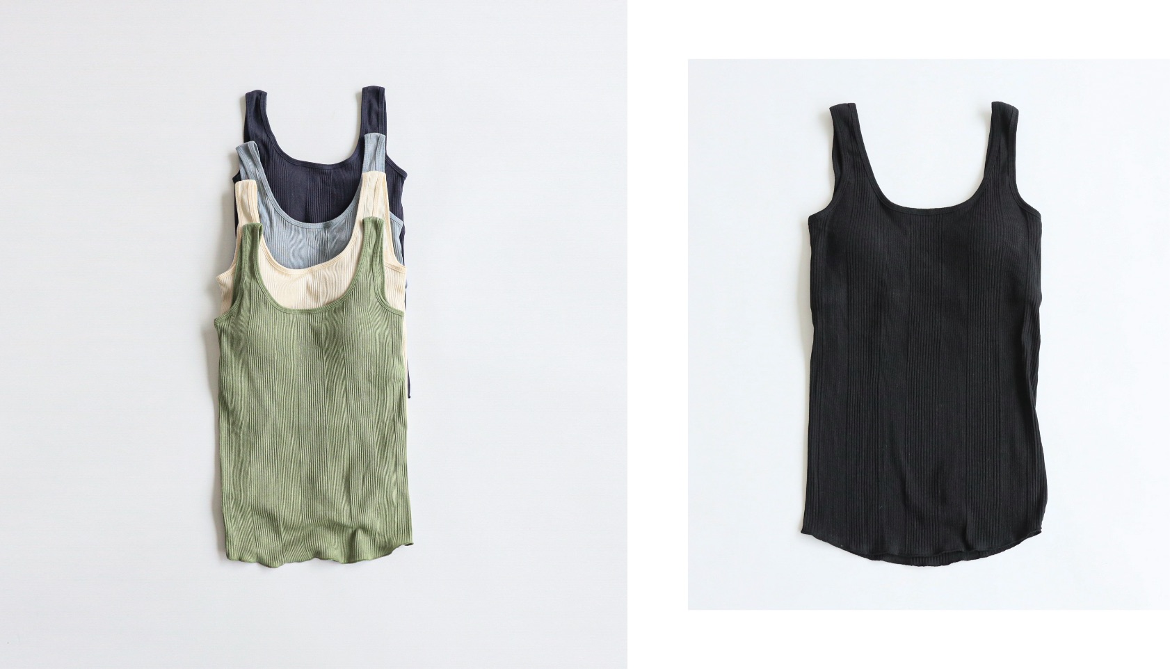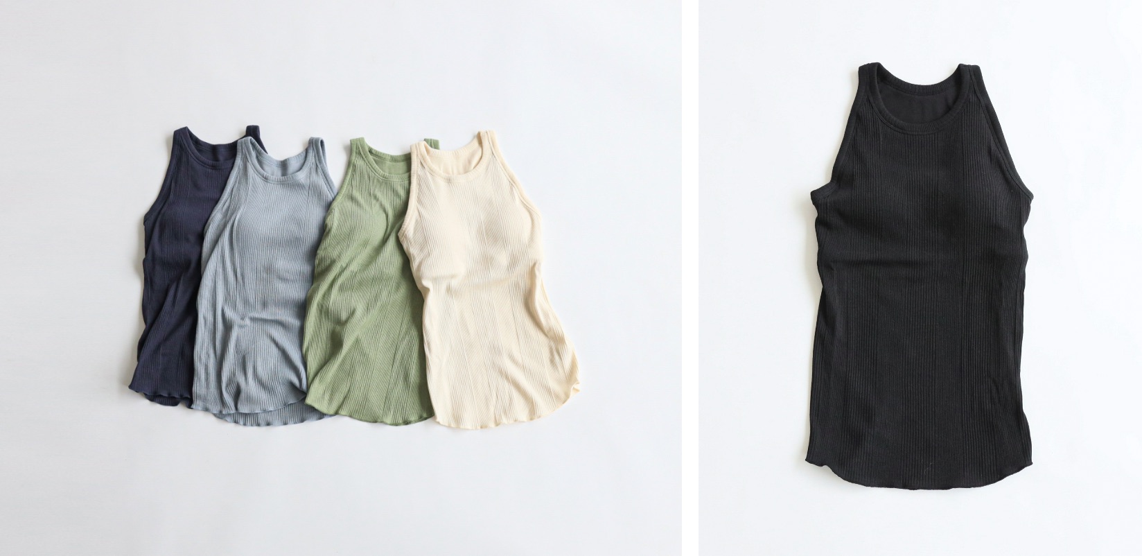 - 新作タンクトップはアーム部分のカット角度やフィット感は何度も試作を重ねて誰が着ても美しいシルエットにこだわって制作しました。