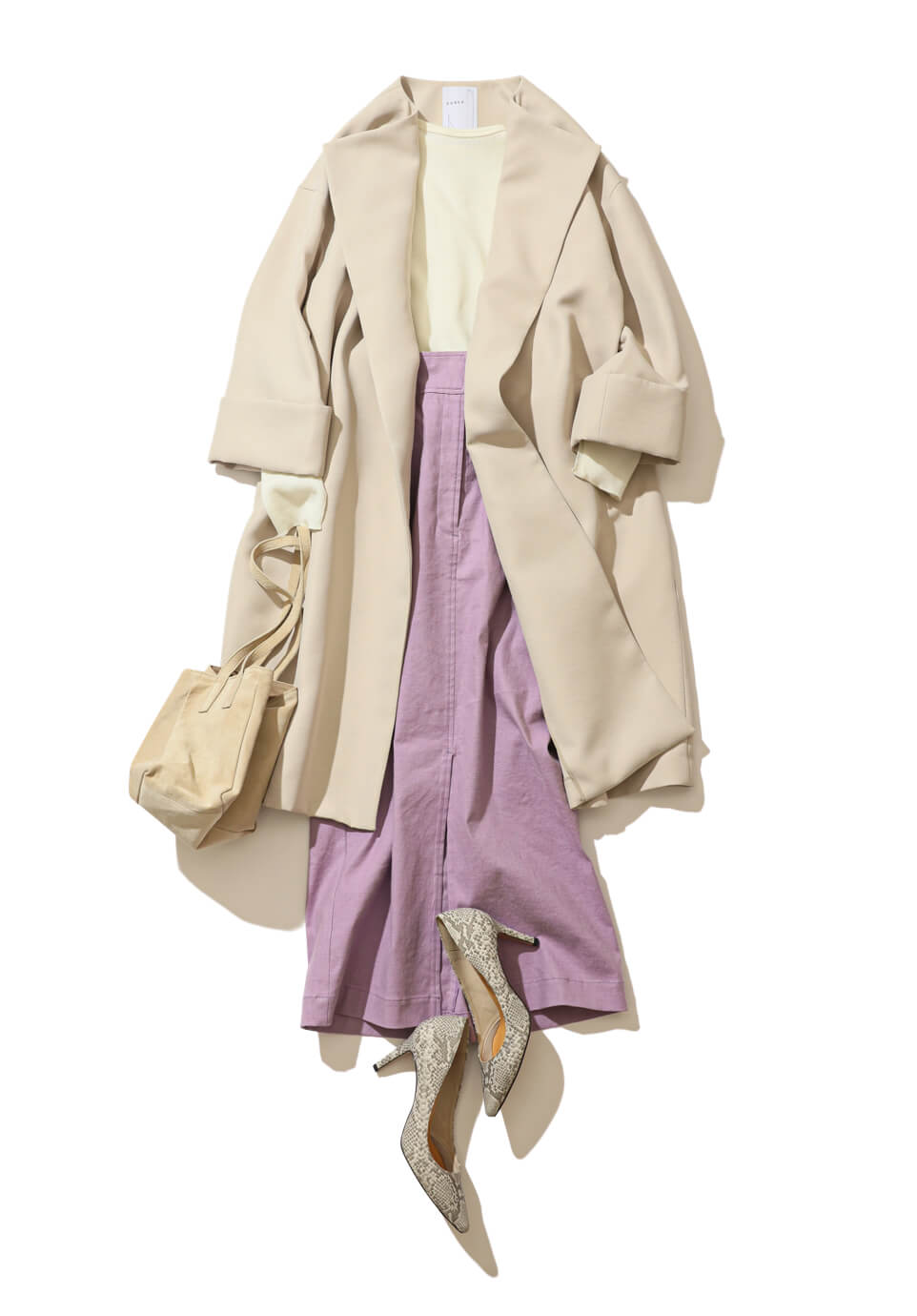 気負わず羽織れてきれいめにキマるガウン風コート、コロンとかわいい巾着バッグといったコーデの“顔”になるアイテムをベージュで統一。ヒールパンプスもトーンを合わせて。ボトムスまでベージュで合わせるのも今っぽいけれど、ライラックの色をアクセントに加えて春らしくまとめて。タイトスカートなら甘すぎず大人っぽい。
