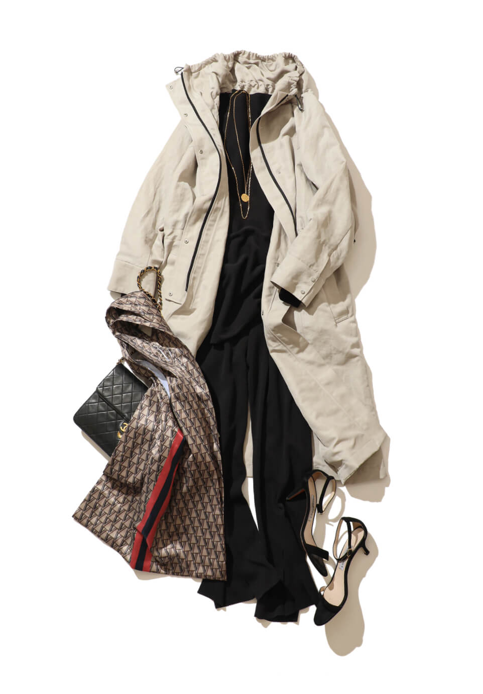 ストレスフリーでまとえるリブニットのプルオーバー&パンツをセットで。華奢なストラップサンダルでレディな要素をプラス。シックなブラックのセットアップには、アクセ使いで春らしさをMIX。ネックレスはチェーンとコインをレイヤード。マウンテンパーカを羽織って一気に垢抜けを狙って。