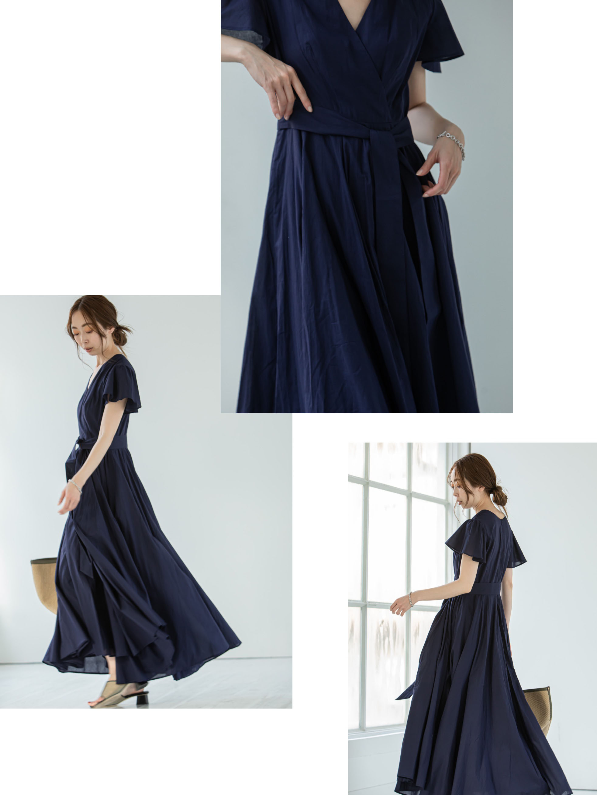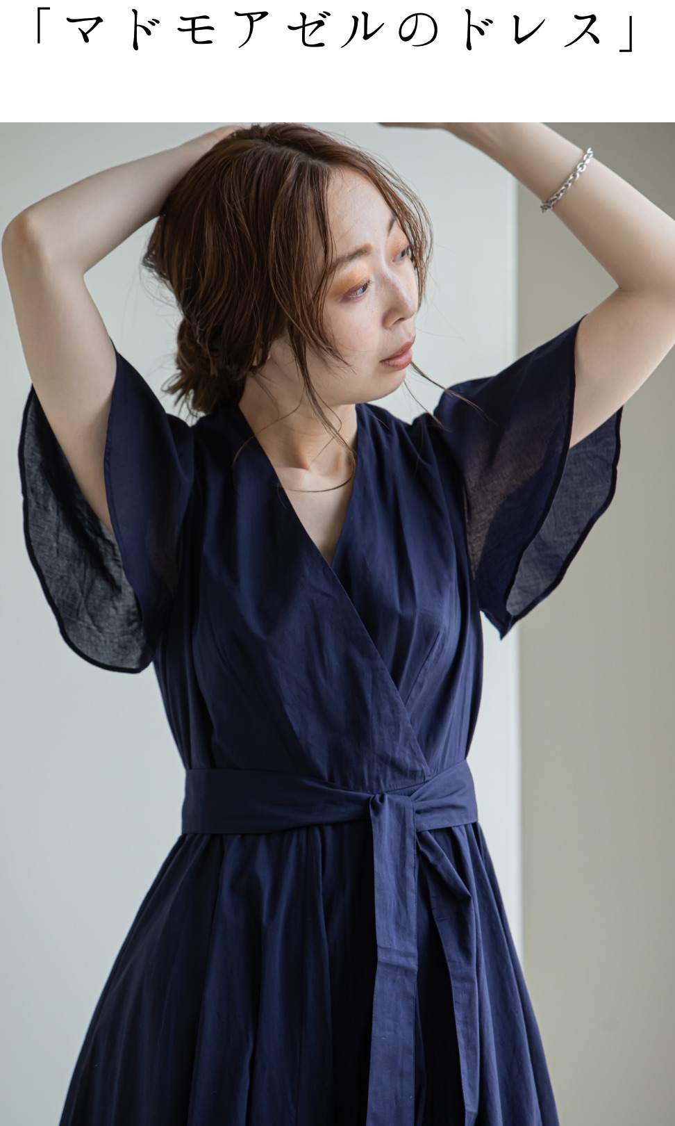 カシュクールデザインとウェービーなフレアスリーブが、エレガントムードを高めてくれます。