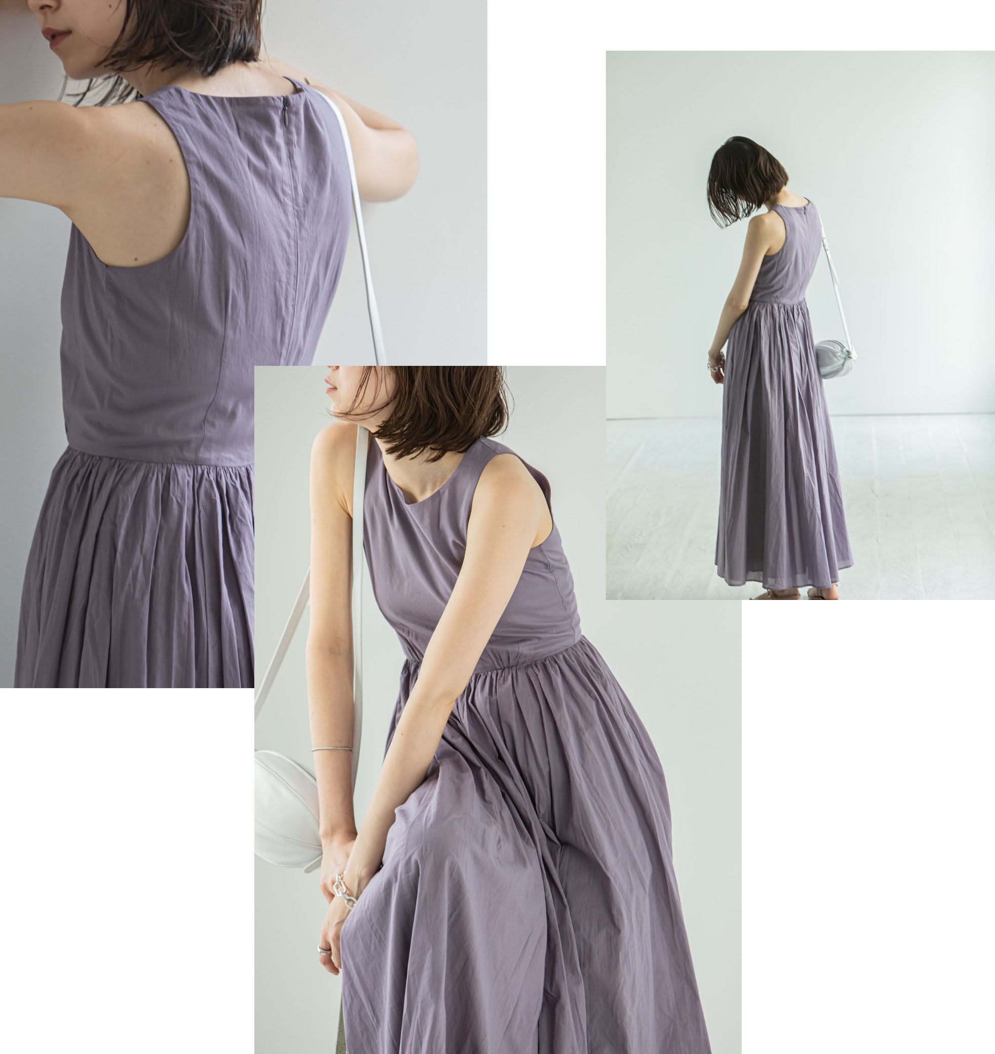 大人のおしゃれ心をくすぐる"くすみパープル"と、ヘルシーな肌見せが叶うアメリカンスリーブが魅力の一着です。
