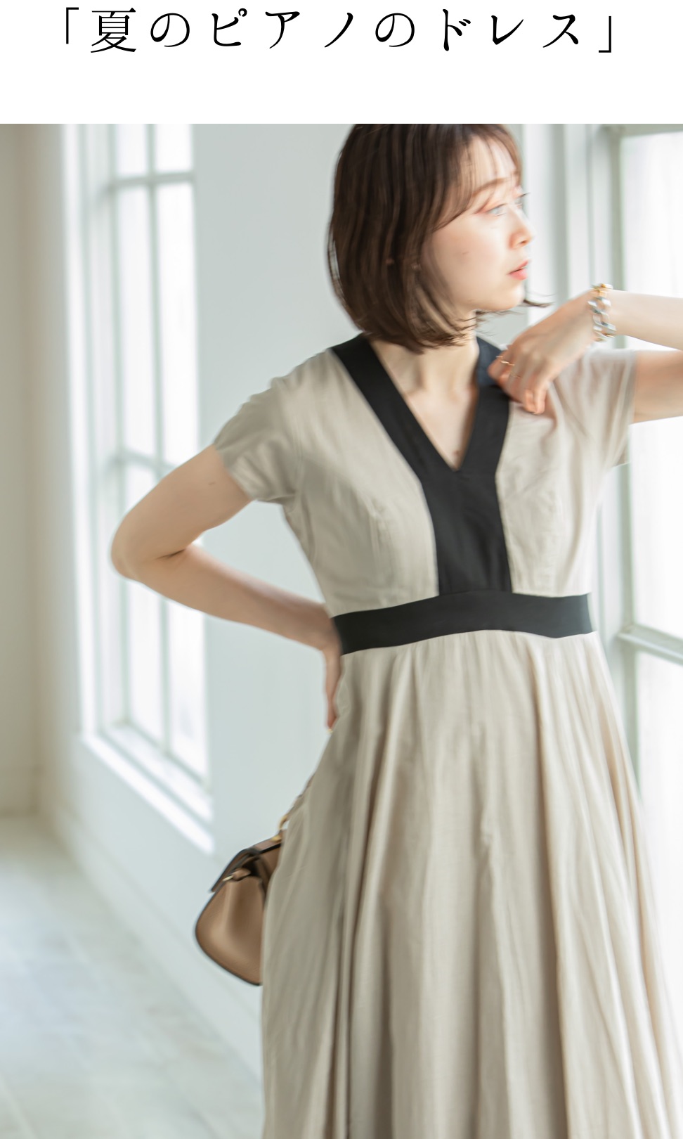 ピアノの鍵盤を連想させるデザイン&控えめなVネックで、品の良さを引き立ててくれる正統派ドレスです。