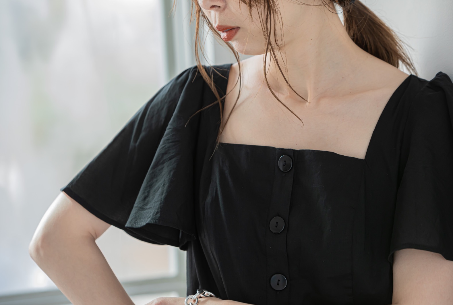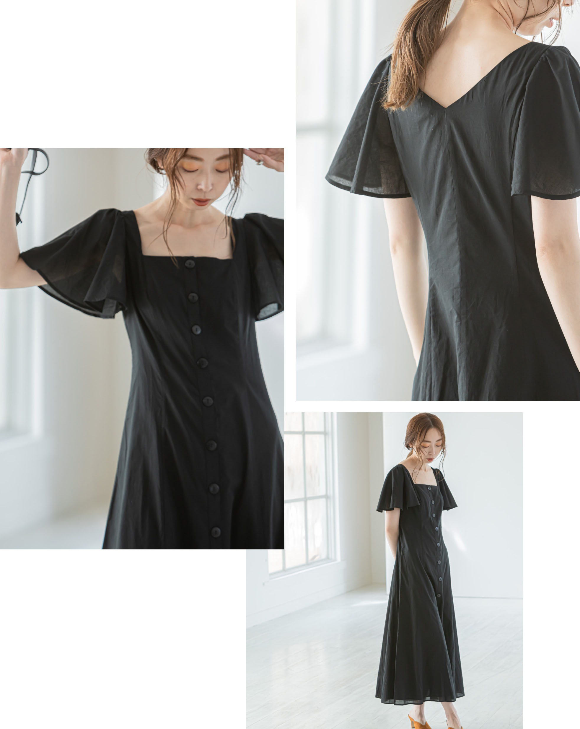 - スクエアネックとフロントボタンが調和した、レトロなムード漂うドレス。