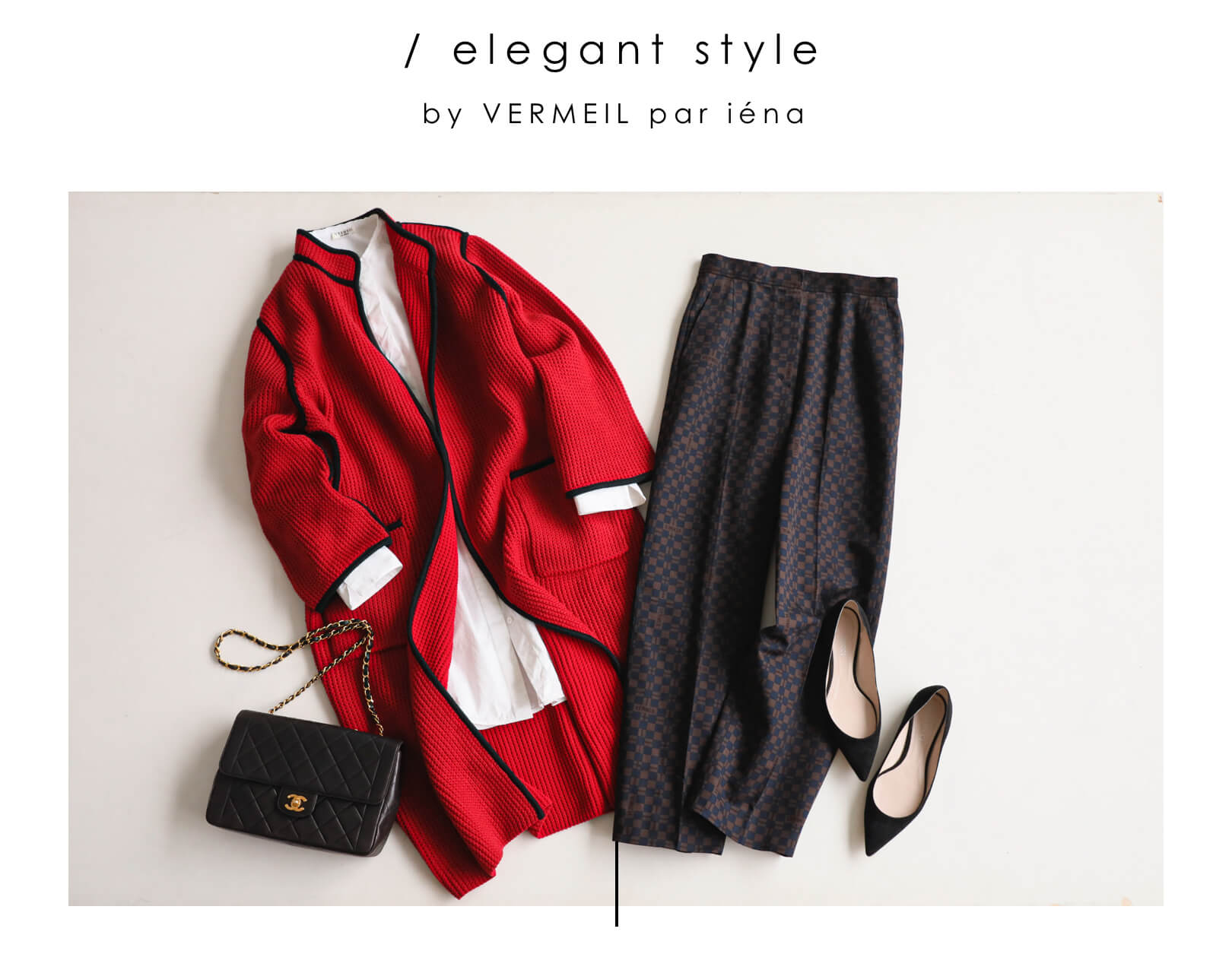 大人になった今こそ、躊躇せず色をまとって思いきりファッションを楽しみたい。いつの時代も女性らしさを高めてくれる、レディな赤のニットコートで艶めきと鮮度をアップ。VERMEIL par ienaオリジナルプリントのテーパードパンツと黒小物が引き立てる、モダンなコーデを完成させて。