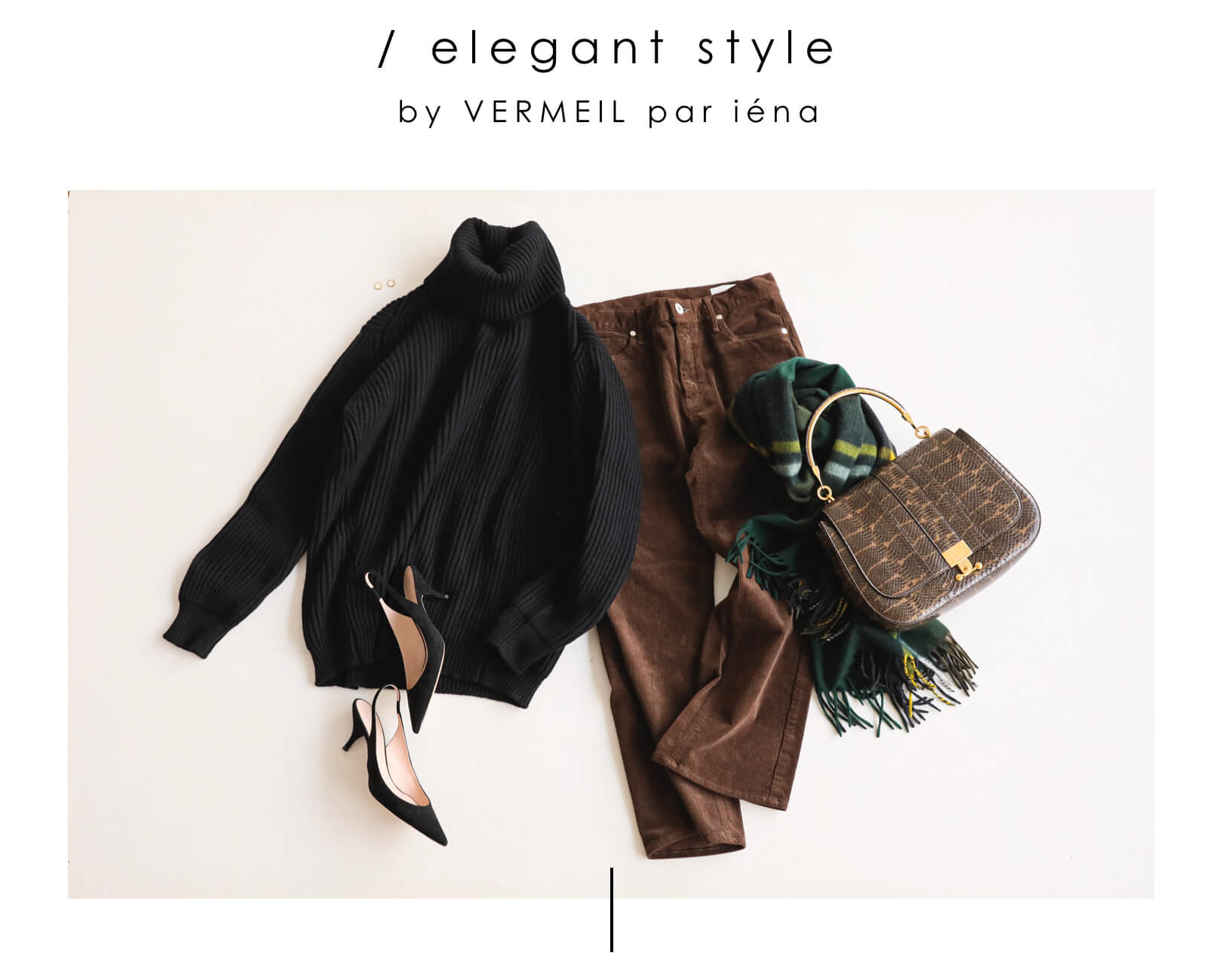 この秋冬、一大旋風を巻き起こしているブラウンブーム。さらにシーズンらしさを高めるコーデュロイパンツは、1本はマストで持っておきたい。ほんのりフレアの最旬シルエットを選んで。ニットと合わせるなら、華やぐヒールパンプス&ゴールドバングルバッグと一緒に、きれいめに履きこなすのがポイントです。