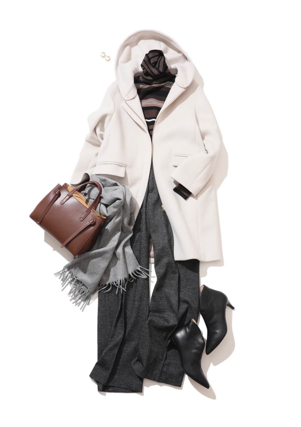 重たくなりがちなダークトーンのパンツコーデを、ナチュラルカラーのフーディーで可憐にブラッシュアップ。ほどよくカジュアルな雰囲気も加わって、親しみやすさを醸し出せそう。そんなアウターからチラリとのぞくのは、マルチボーダーのリブニット。ハンサムボトムスの大人コーデに、柄物で奥行きと変化球を。
