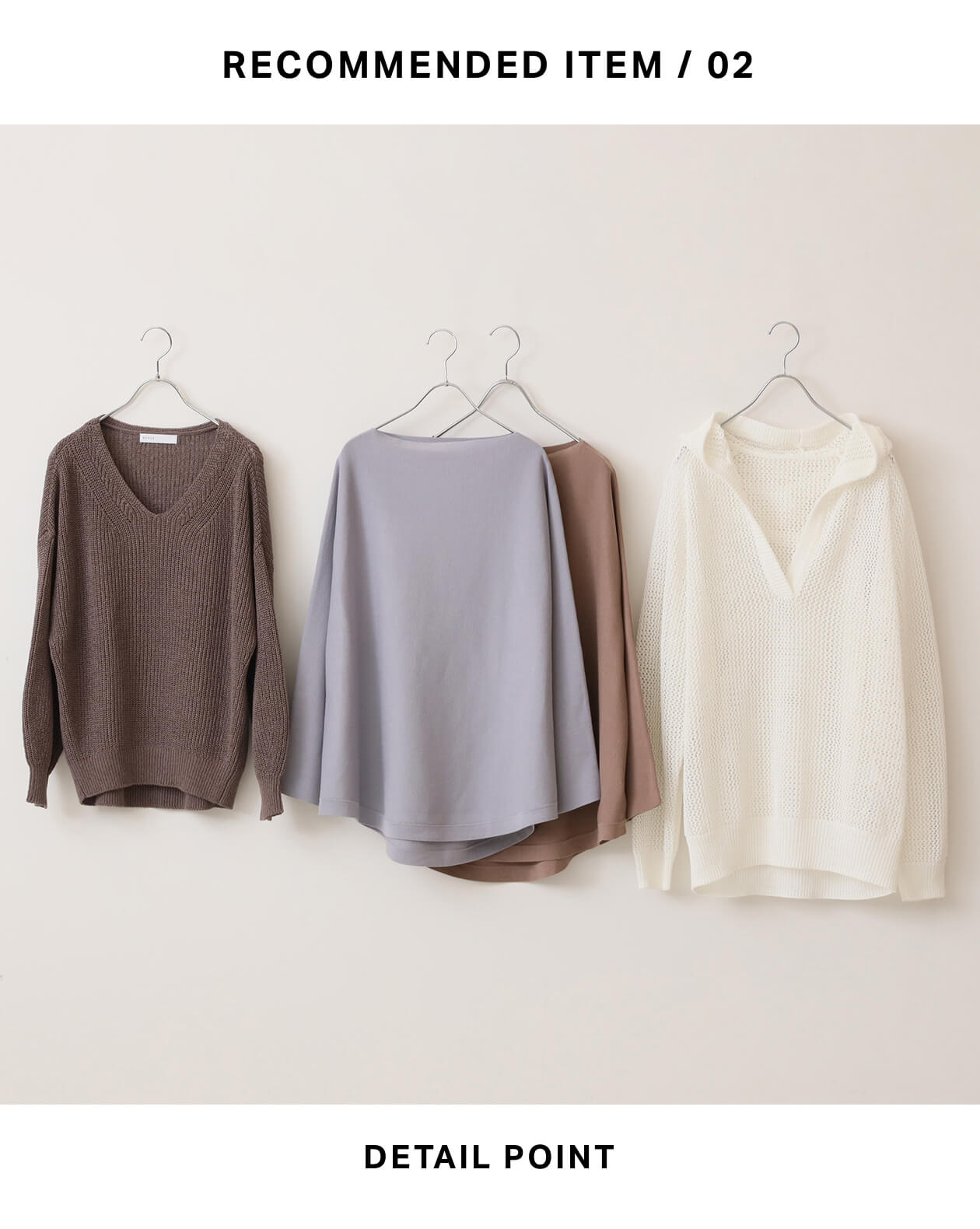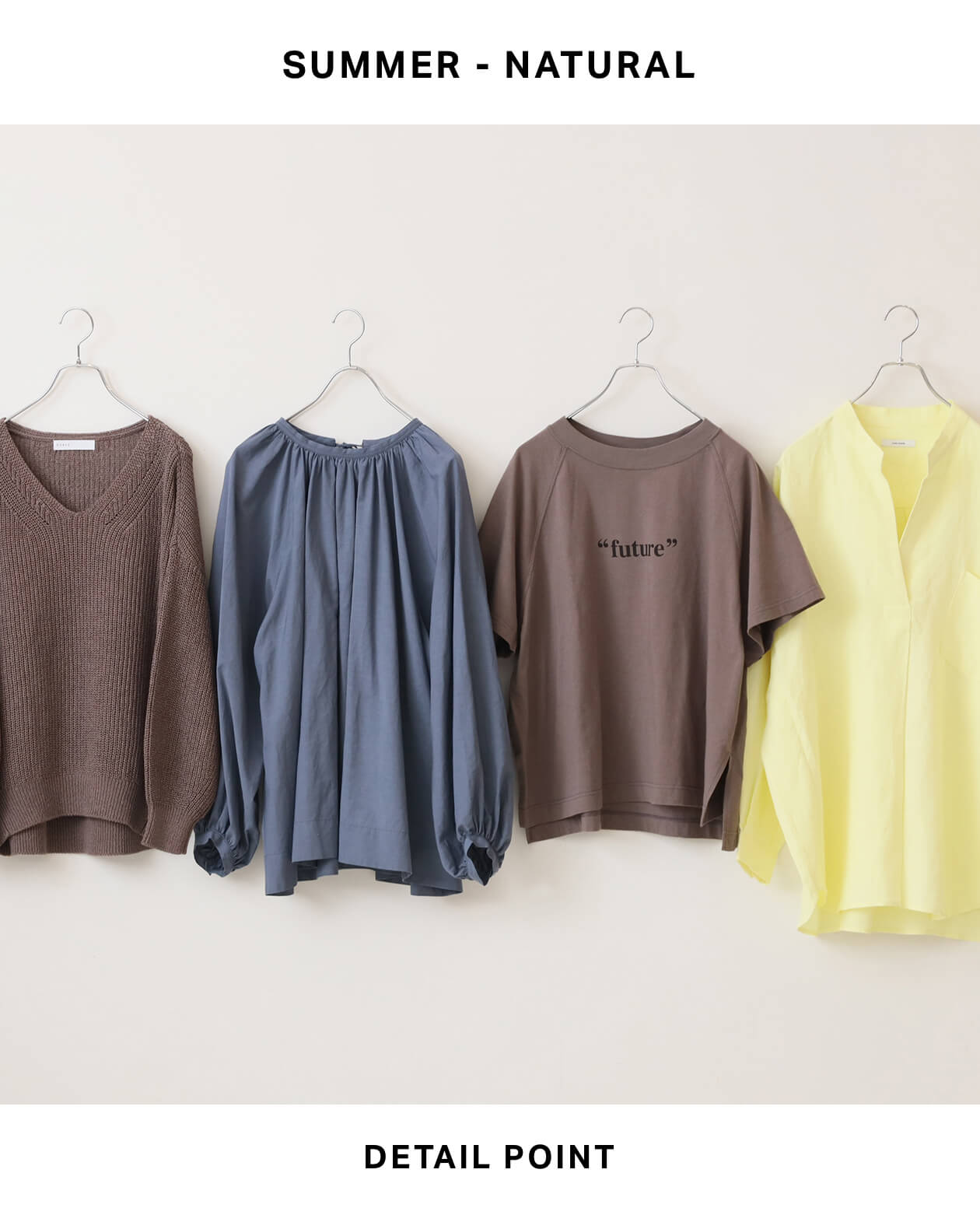 ルーズなシルエットの方が、より女性らしさが引き立つナチュラルタイプ。ゆったりとしたギャザーのブラウスや、ざっくりニットが好相性です。甘すぎないダスティブルーを選べば、子どもっぽくならず◎。柄ものならカジュアルなロゴやボーダーなどがおすすめ。 - NOBLEコットンリネン 5G畔Vプルオーバー◆¥16,500(税込)