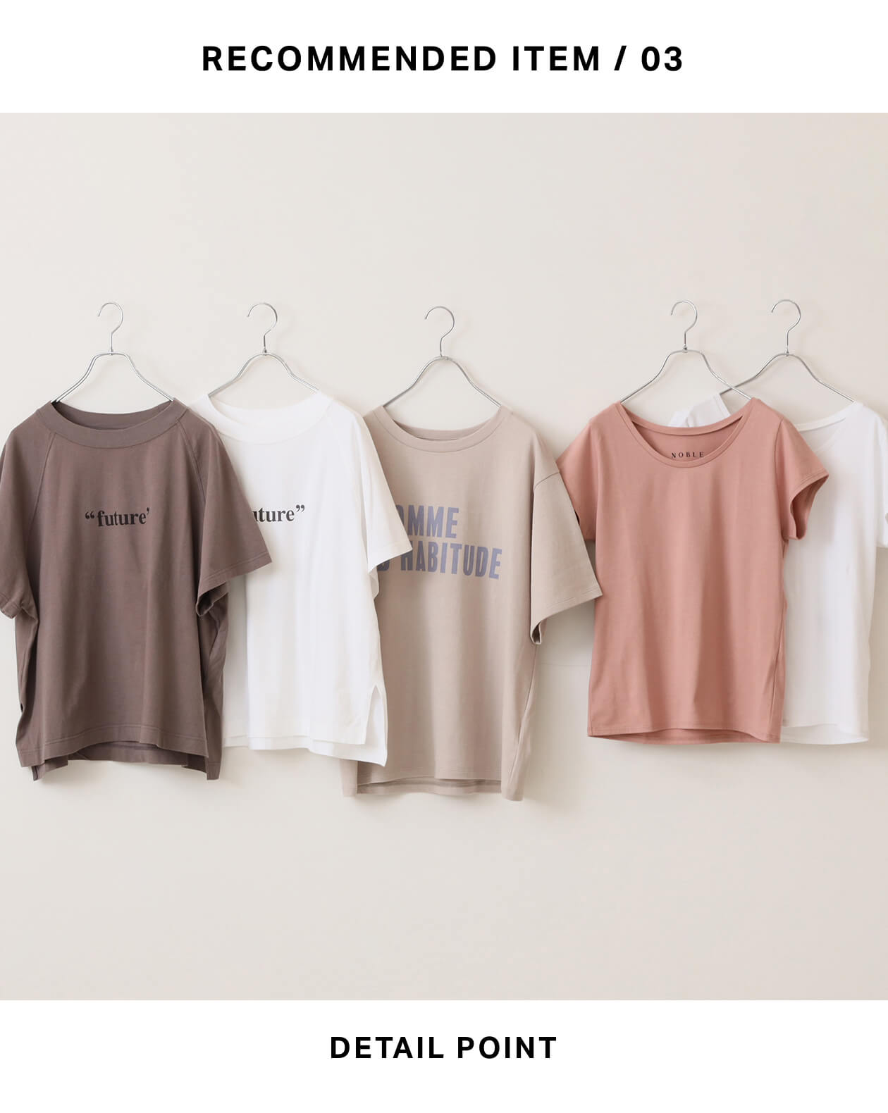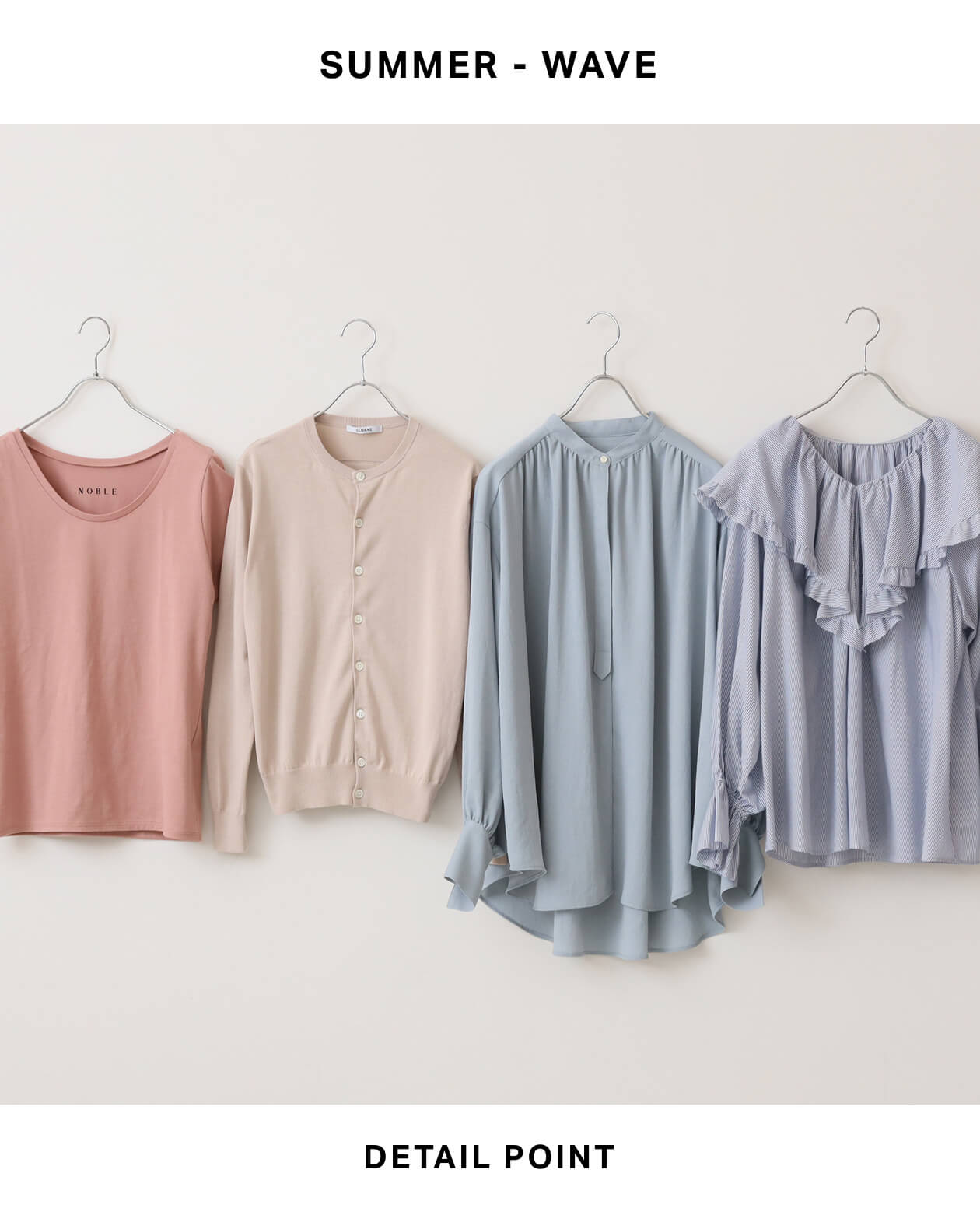 薄手のとろみ素材が似合うウェーブタイプ。シャツもやわらかい素材のシャツブラウスタイプがおすすめです。大人フェミニンに仕上がるウエストリボンやフリルのデザインで、ウェーブさんらしい女性らしさをプラスして。 - NOBLE《追加》イスラエルピマテンジクUネックTシャツ◆¥8,690(税込)