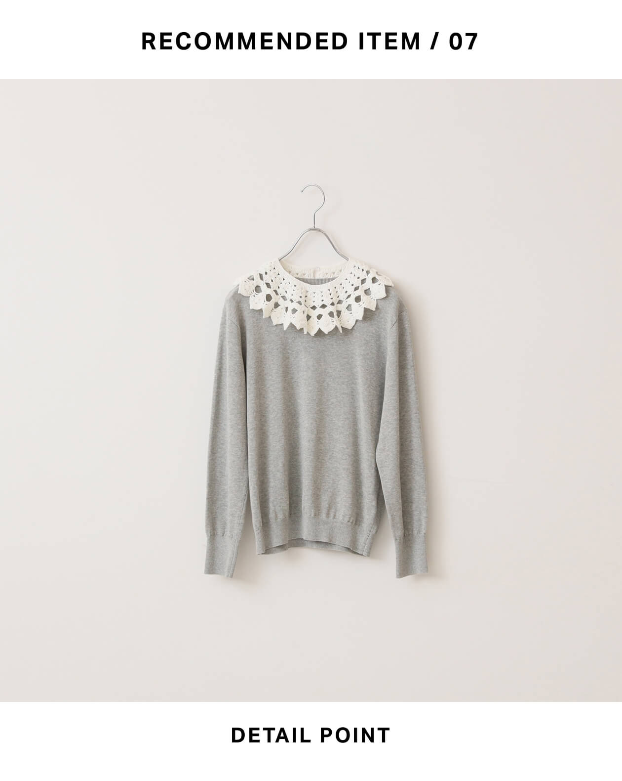 ベーシックなグレーとホワイトの組み合わせで取り入れやすい襟付きニット。青みのあるカラーで可愛くなりすぎないのがポイントです。クロシェ編みの襟は取り外し可能なので、気分に合わせてシンプルにもトレンドのコーデにも両方楽しめるのが嬉しい。 - SLOBE IENAデタッチャブルクロシェカラープルオーバー◆¥11,000(税込)