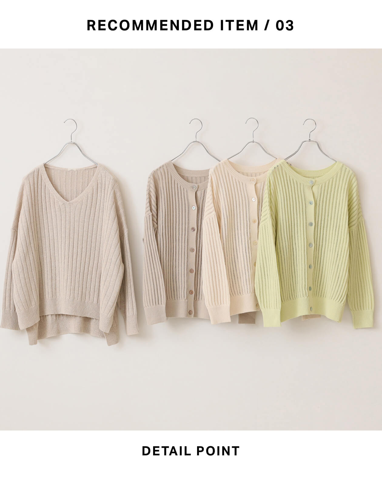 オータムさんに似合う深めの色味でも、ローゲージやメッシュで軽さがあるのが特徴。ピンクやグリーンは黄みとくすみのある色味がおすすめです。ふんわり立体感のある編み立てに、メッシュの抜け感を加えたニットは、プルオーバーとしてもカーディガンとしても着られる嬉しい2WAY仕様。 - IENAテープヤーン ワイドリブ Vネックプルオーバー◆¥13,200(税込)