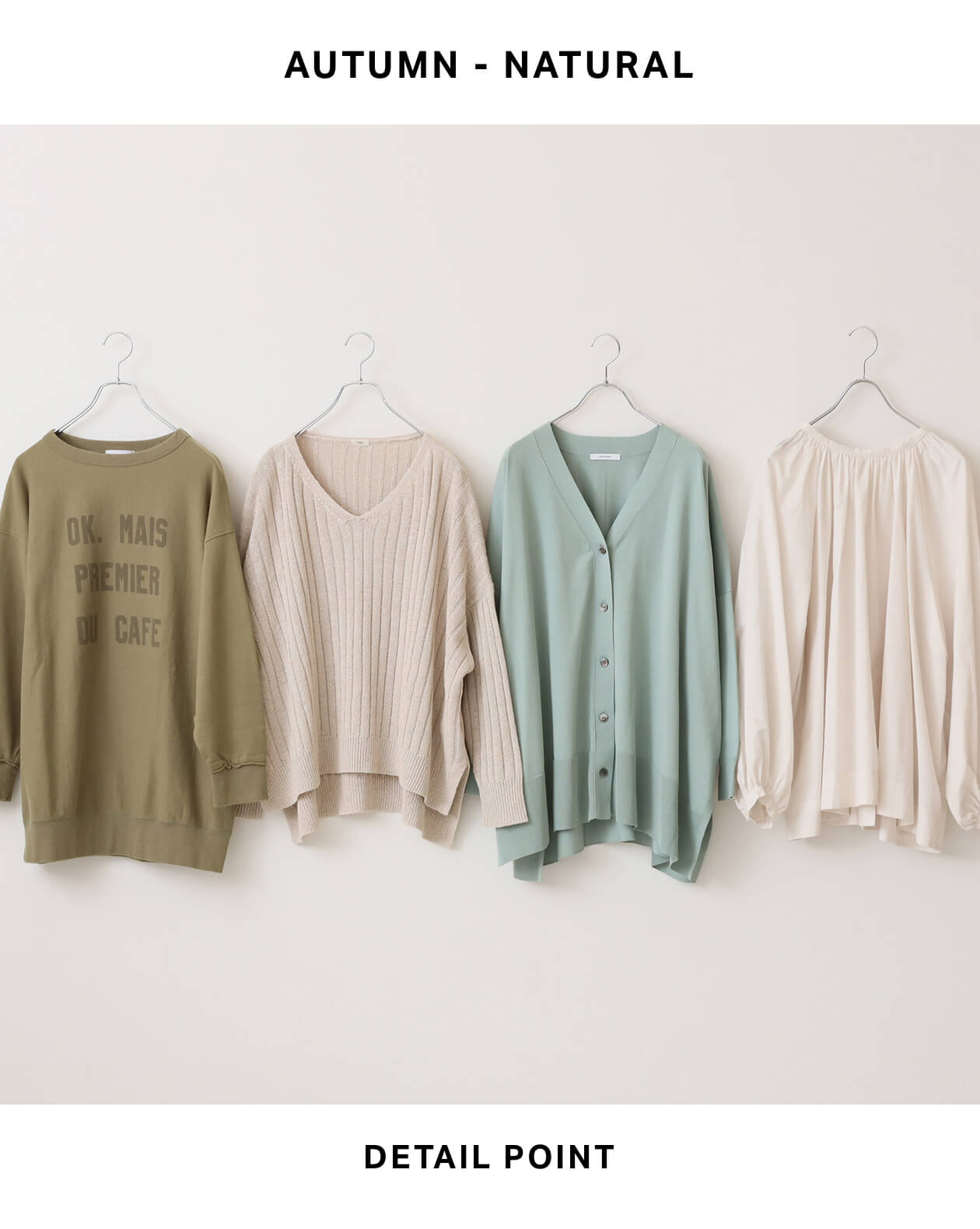 ルーズなシルエットの方が、より女性らしさが引き立つナチュラルタイプ。ゆったりとしたギャザーのブラウスや、ざっくりニットが好相性です。柄ものならカジュアルなロゴやボーダーなどがおすすめ。カーキにうっすらと同色のステートメントをのせたスウェットなら大人っぽく着こなせます。 - SLOBE IENAOKグラフィックロゴBIGスウェット◆¥7,700(税込)