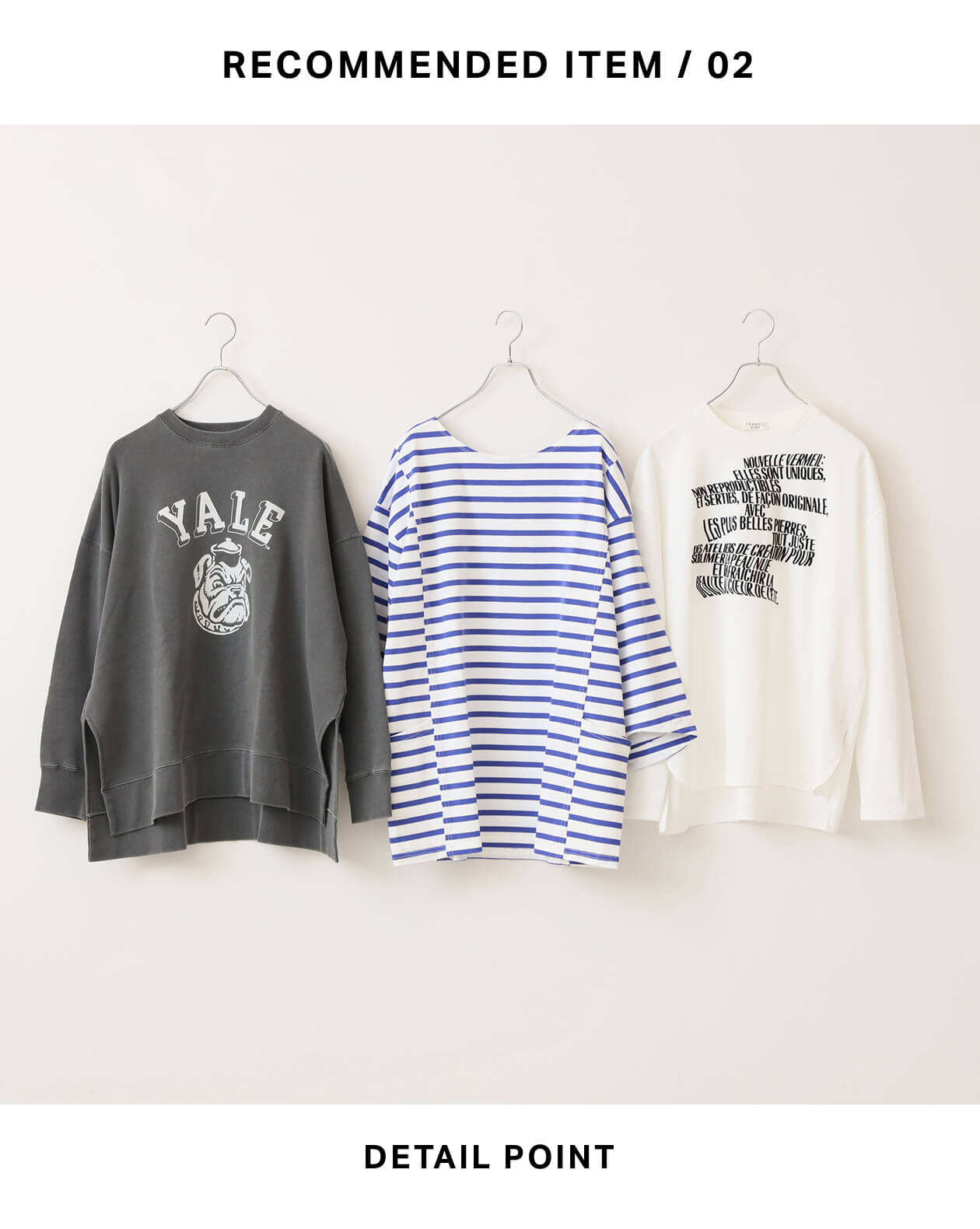 カジュアルなカットソーは定番のグレーやホワイトがおすすめ。ウィンターさんならパキッとしたブルーのボーダーもはっきりとした色に負けず華やかに着こなせます。ロンTは、フロッキープリントでのせたグラフィックが新鮮な印象。 - JOURNAL STANDARD relume《追加3》セイヒンゾメカレッジスリットスウェット◆¥8,800(税込)