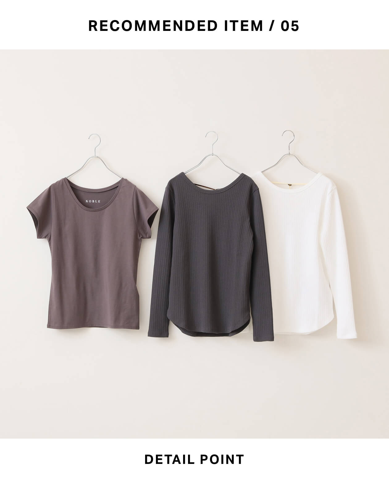 ゆったりとした印象のカットソーはリラックスムードあふれる色味が一押し。はっきりしたモノトーンではなく、グレーやグレージュ系でニュアンスをプラスするのがポイントです。ワードローブで活躍するリブカットソーは、キャッチーなバックデザインに注目。 - NOBLE《追加》イスラエルピマテンジクUネックTシャツ◆¥8,690(税込)