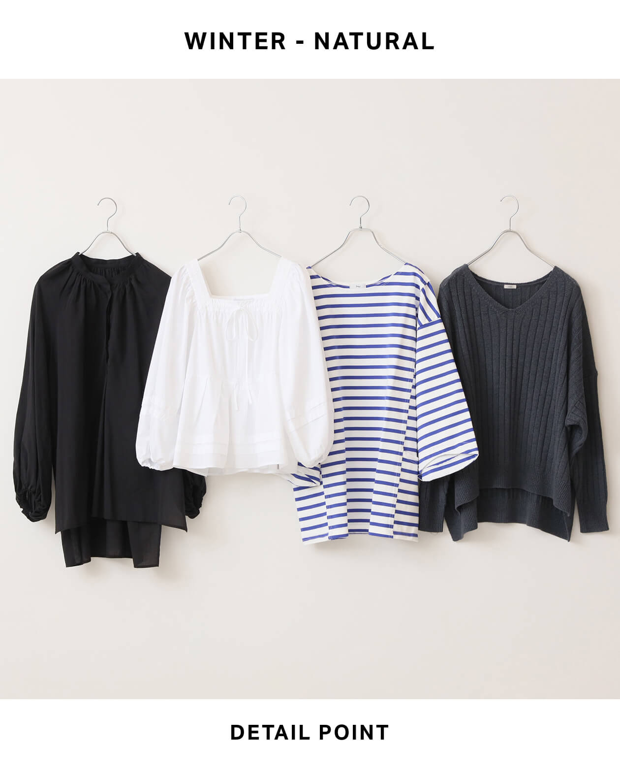 ルーズなシルエットの方が、より女性らしさが引き立つナチュラルタイプ。ゆったりとしたギャザーのブラウスや、ざっくりニットが好相性です。柄ものならカジュアルなロゴやボーダーなどがおすすめ。春の定番、バスクシャツは鮮やかで着映えるロイヤルブルーのボーダーにアップデートを。 - JOURNAL STANDARD L'ESSAGE60ローンギャザーブラウス◆¥17,600(税込)